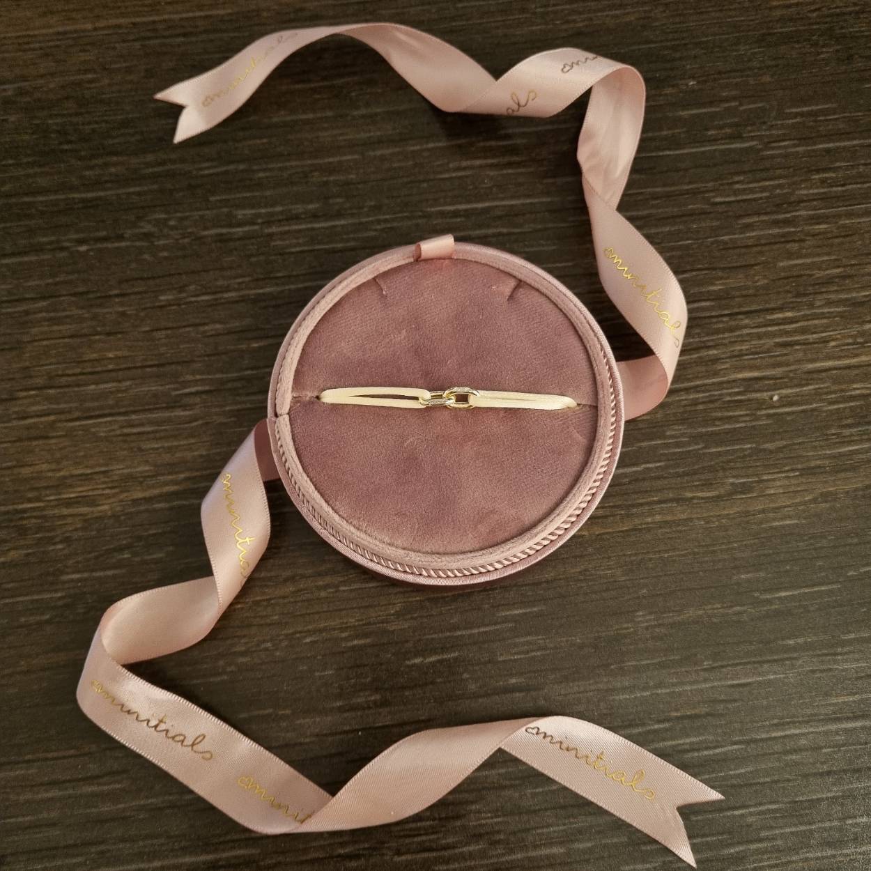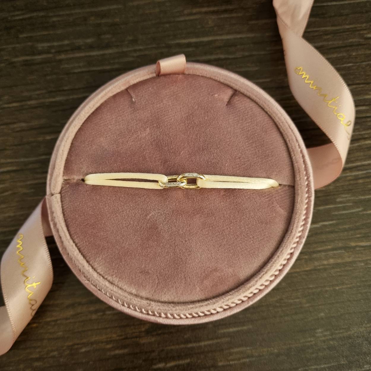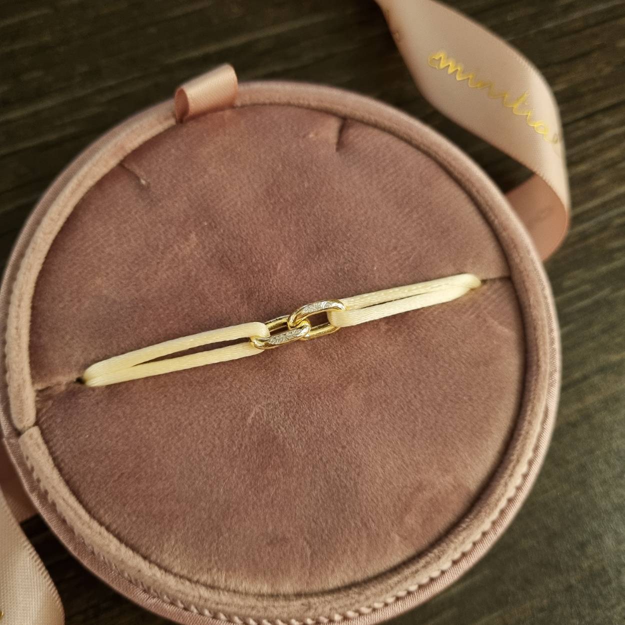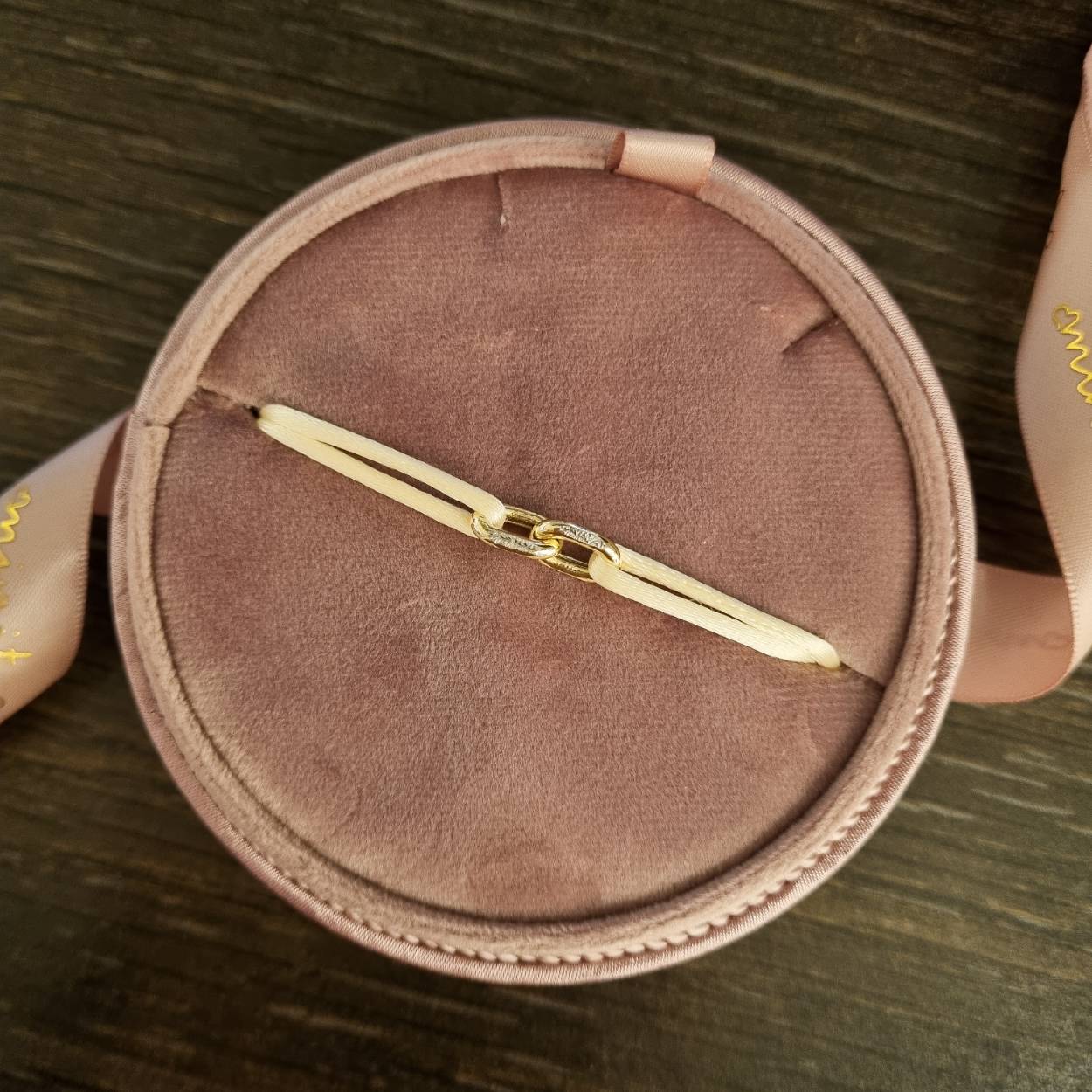 Deze prachtige Minitials Unchained armband is voorzien van twee 18 karaat gouden schakels. U kunt de kleur van de satijnen armband veranderen naar keuze.