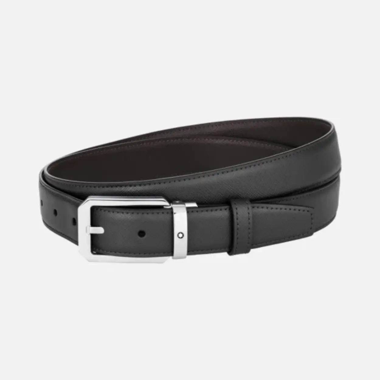 Zelfverstelbare, 3 cm x 120 cm, omkeerbare leren riem met saffianoprint in zwart en bruin. Ontworpen voor een klassieke look met een twist.