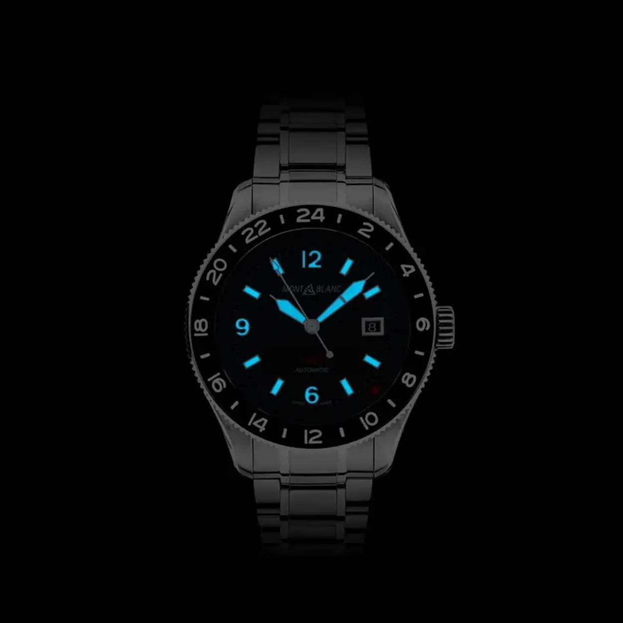 Waar de meeste GMT-uurwerken de tweede tijdzone aangeven met een extra wijzer, presenteert de Montblanc 1858 GMT zijn GMT-aanduiding zonder wijzers die zeer intuïtief en goed leesbaar is. De Montblanc 1858 GMT geeft de tweede tijdzone aan met een rood vierkant dat rond de buitenkant van de wijzerplaat beweegt. Dit rode vierkant bevindt zich naast een vaste blauw geanodiseerde aluminium bezel met een 24-uurs klok. Dit systeem geeft ook de halve uren aan. Andere functies zijn een datum en een centrale secondewijzer. Het uurwerk is gehuisvest in een 42 mm roestvrijstalen kast en wordt geleverd met een zwarte sunray-wijzerplaat en een taps toelopende verwisselbare roestvrijstalen armband met fijnafstelling voor een nauwkeurige pasvorm. Een gravure op de achterkant van de kast toont de continenten, oceanen en namen van steden in elk van de 24 tijdzones, wat een indicatie van de wereldtijd biedt.