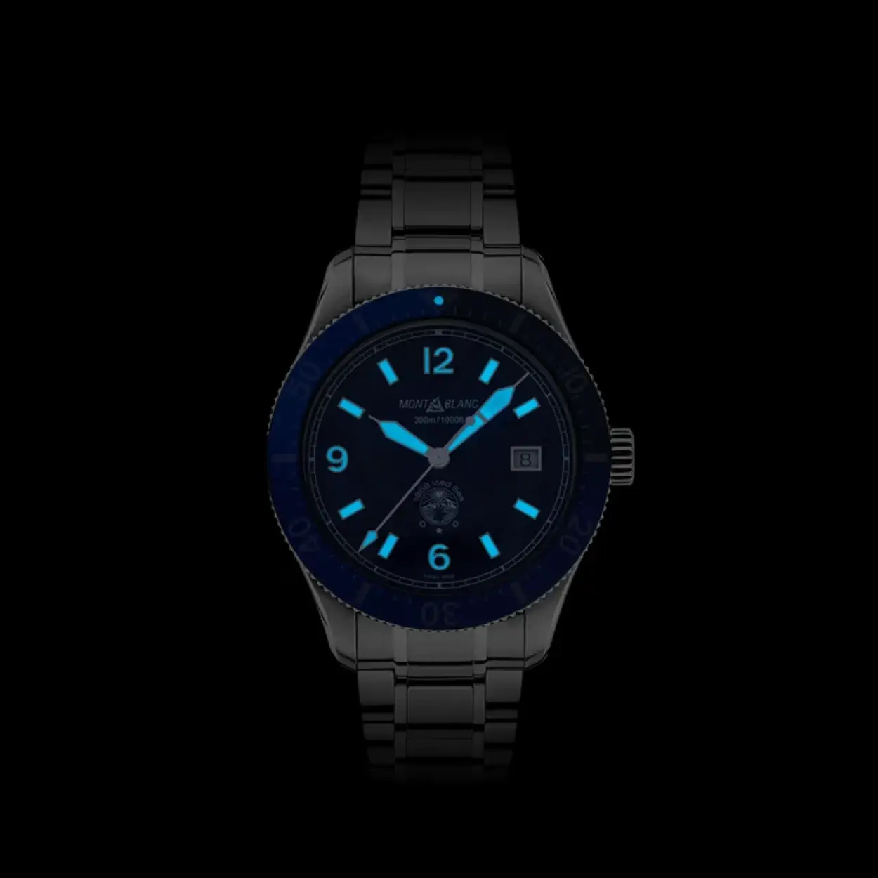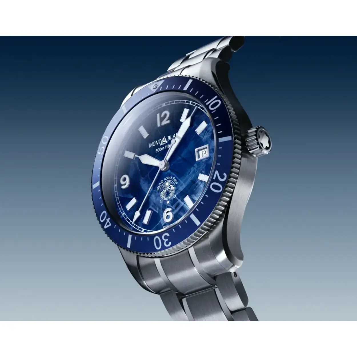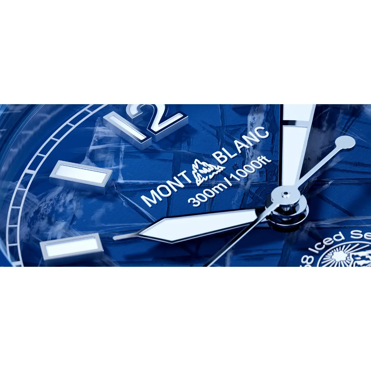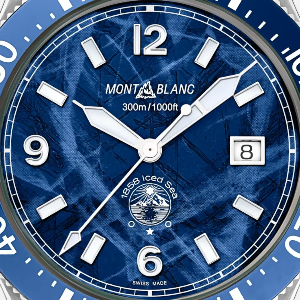 Het allereerste sportduikhorloge voor Montblanc, de Montblanc 1858 Iced Sea Automatic Date. Het horloge heeft een unieke wijzerplaat, waarbij het lijkt alsof je diep in een gletsjer kijkt. Dit blauwe gletsjerpatroon ontleent zijn inspiratie aan de Mer de Glace – ijszee – de belangrijkste gletsjer op de Mont-Blanc. De textuur werd bereikt met behulp van een bijna vergeten voorouderlijke techniek genaamd gratté-boisé. Het uurwerk wordt geleverd met een unidirectionele tweekleurige keramische ring, een gegraveerde achterkant van de kast en een taps toelopende verwisselbare roestvrijstalen armband met fijnafstelling voor een nauwkeurige pasvorm. Het uurwerk voldoet aan de ISO 6425 norm voor duikhorloges en is waterdicht tot 300 meter.