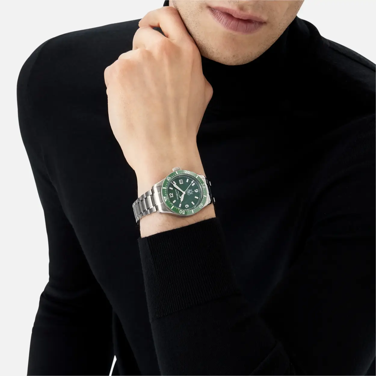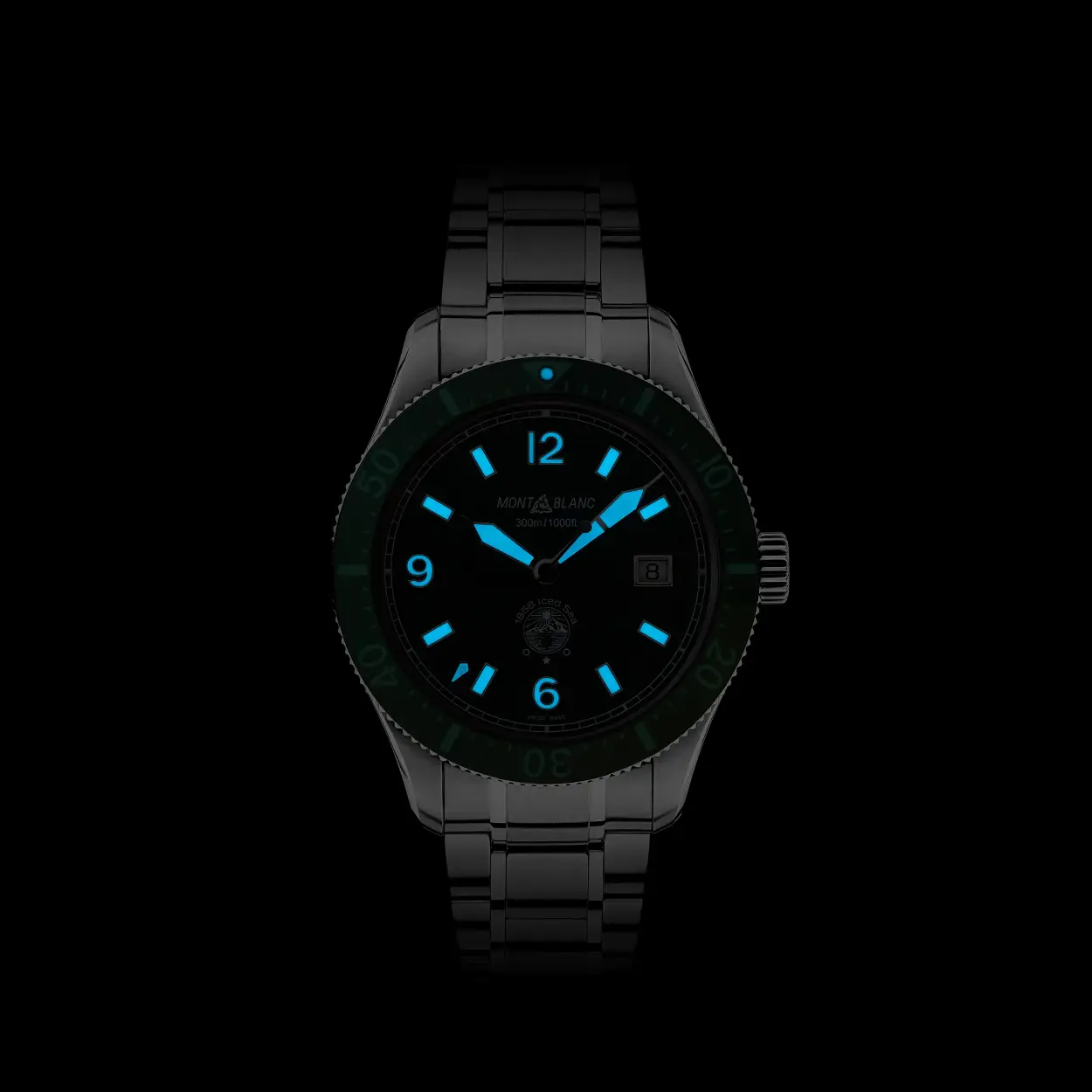 Het allereerste sportduikhorloge voor Montblanc, de Montblanc 1858 Iced Sea Automatic Date, heeft een wijzerplaat met gletsjerpatroon die de indruk wekt in de diepten van een gletsjer te kijken. Deze groene wijzerplaat met glaciaal patroon is geïnspireerd op de Mer de Glace - Sea of ​​Ice - de belangrijkste gletsjer van het Mont-Blanc-massief. De textuur werd bereikt met behulp van een bijna vergeten voorouderlijke techniek genaamd gratté-boisé. Het uurwerk wordt geleverd met een unidirectionele tweekleurige keramische ring, een gegraveerde achterkant van de kast en een taps toelopende verwisselbare roestvrijstalen armband met fijnafstelling voor een nauwkeurige pasvorm. Het uurwerk voldoet aan de ISO 6425 norm voor duikhorloges en is waterdicht tot 300 meter.