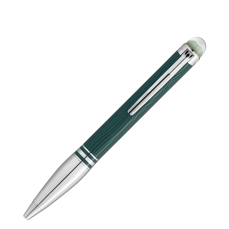 StarWalker PolarGreen brengt de schoonheid van het noorderlicht tot leven. Op aarde kunnen mensen naar de hemel staren en zich laten meevoeren naar wonderlijke sferen terwijl ze getuige zijn van dit grootse schouwspel. De koepel op de dop is gemaakt van transparant hars en gloeit bij weinig licht, wat doet denken aan de betoverende dansende aurora's aan de nachtelijke hemel. Het golfpatroon op het donkergroene, kostbare hars van de houder legt de spectrale glans van het licht prachtig vast, en de matte afwerking accentueert de fraaie reflecties. De donkergroene harsringen aan de voorzijde accentueren de platina-gecoate fittingen van de balpen.