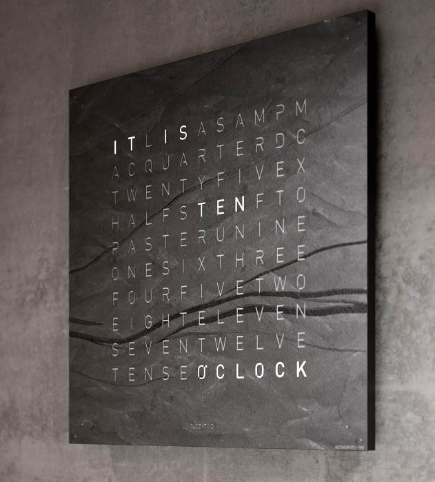 Voor de QLOCKTWO CREATOR'S EDITION METAMORPHITE moest 350 tot 400 miljoen jaar druk worden uitgeoefend totdat grijze leisteen werd gevormd uit kleislurry, die uiteindelijk de voorkant van een QLOCKTWO siert.