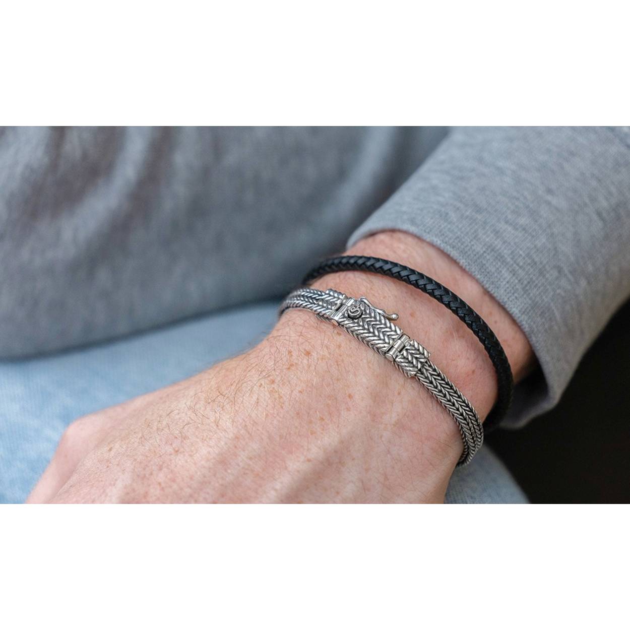 Het ongeëvenaarde vakmanschap van SILK komt tot leven in elk handgemaakt zilveren sieraad. Deze zwarte leren armband uit de Crossline-collectie belichaamt het uitzonderlijke meesterschap van onze ervaren SILK-ambachtslieden. De gedetailleerde structuur van de handgeweven Crossline-band is met zorg geïntegreerd in de massief zilveren sluiting, wat zorgt voor een unieke, stijlvolle en tijdloze uitstraling. Elke armband wordt met de hand vervaardigd, met oog voor detail, kwaliteit en duurzaamheid. Naast zwart leer is deze armband ook verkrijgbaar in donkerbruin en blauw leer.
