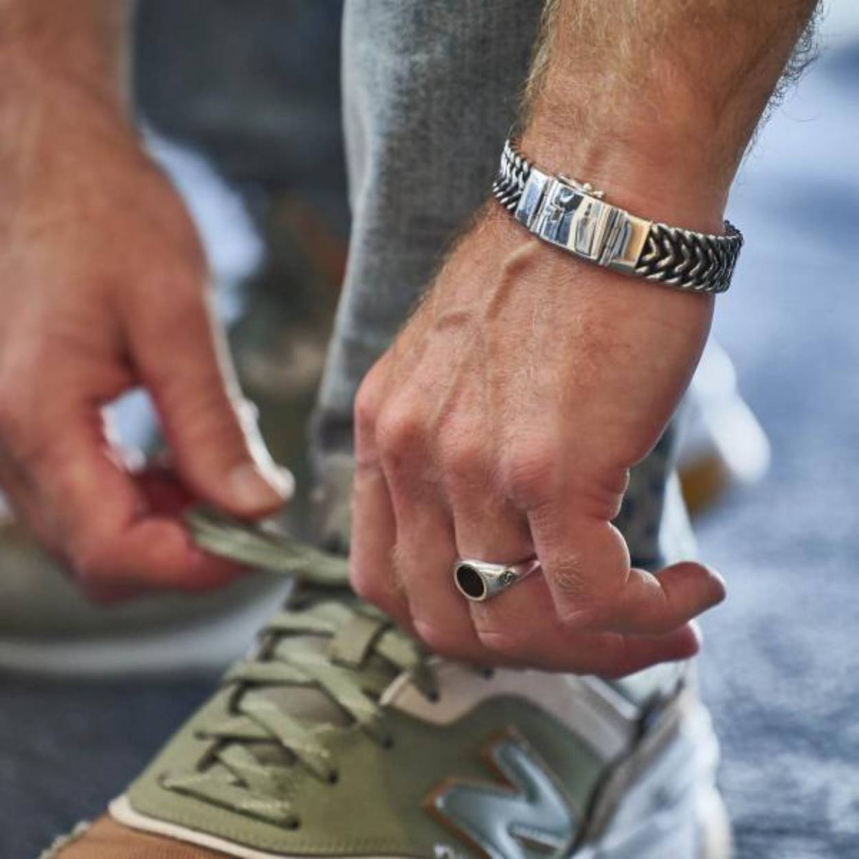 De armband valt plat op de pols. De schakels van de armband vallen als een 8 in elkaar. Deze armband is van binnen geoxideerd en krijgt daardoor een mooie donkere gloed van binnenuit. De armband sluit middels een stevig bakslot welke zich uitstekend leent voor een mooie gravure.