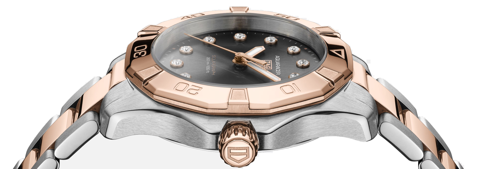 De zwarte, geborstelde sunray wijzerplaat, versierd met 11 sprankelende diamanten indexen, reflecteert het licht als de stralen van de ondergaande zon op het water. De wijzers van 18-karaats 5N roségoud en het TAG Heuer-logo geven de wijzerplaat een zachte warmte.