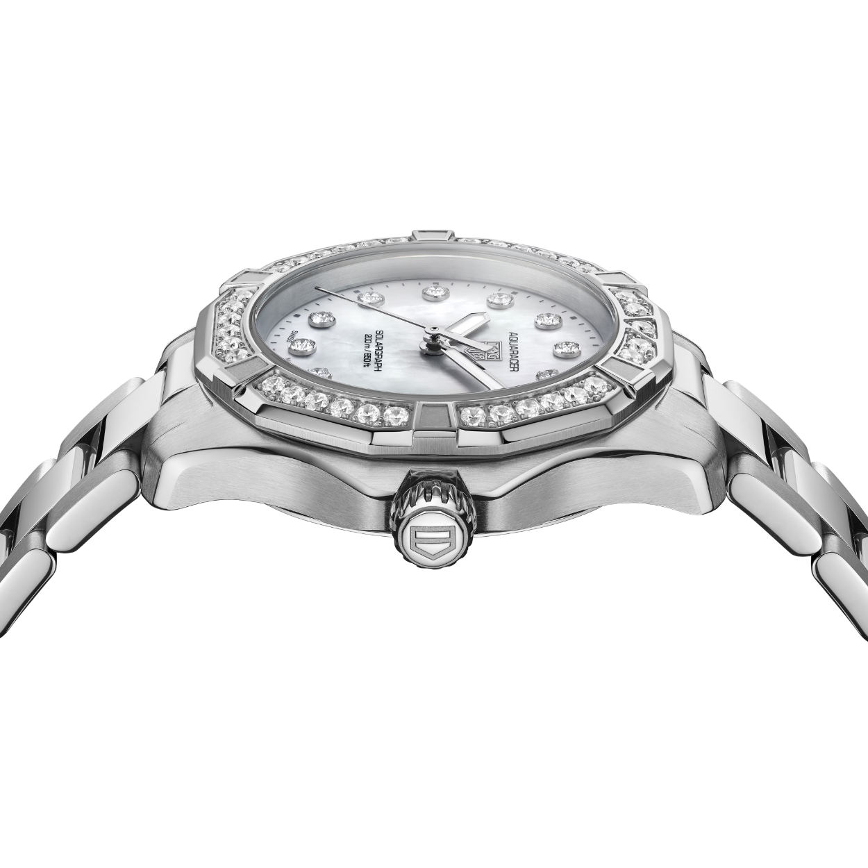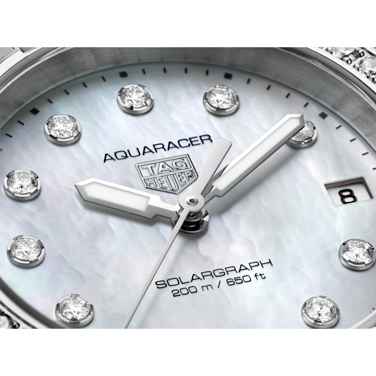 De parelmoer geborstelde wijzerplaat is versierd met diamanten indexen en gerhodineerde wijzers, gevuld met witte Super-LumiNova® voor optimale leesbaarheid - en een zilverkleurige secondewijzer met Super-LumiNova®. Bijkomend is de besel nog eens prachtig versierd met echte diamanten.