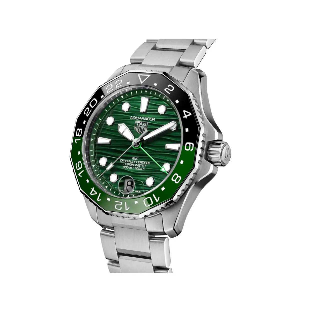De op de oceaan geïnspireerde, diepgroene, sunray geborstelde wijzerplaat toont heldere, met Super-LumiNova® gevulde wijzers en indexen en een opvallende lichtgroene GMT-wijzer.