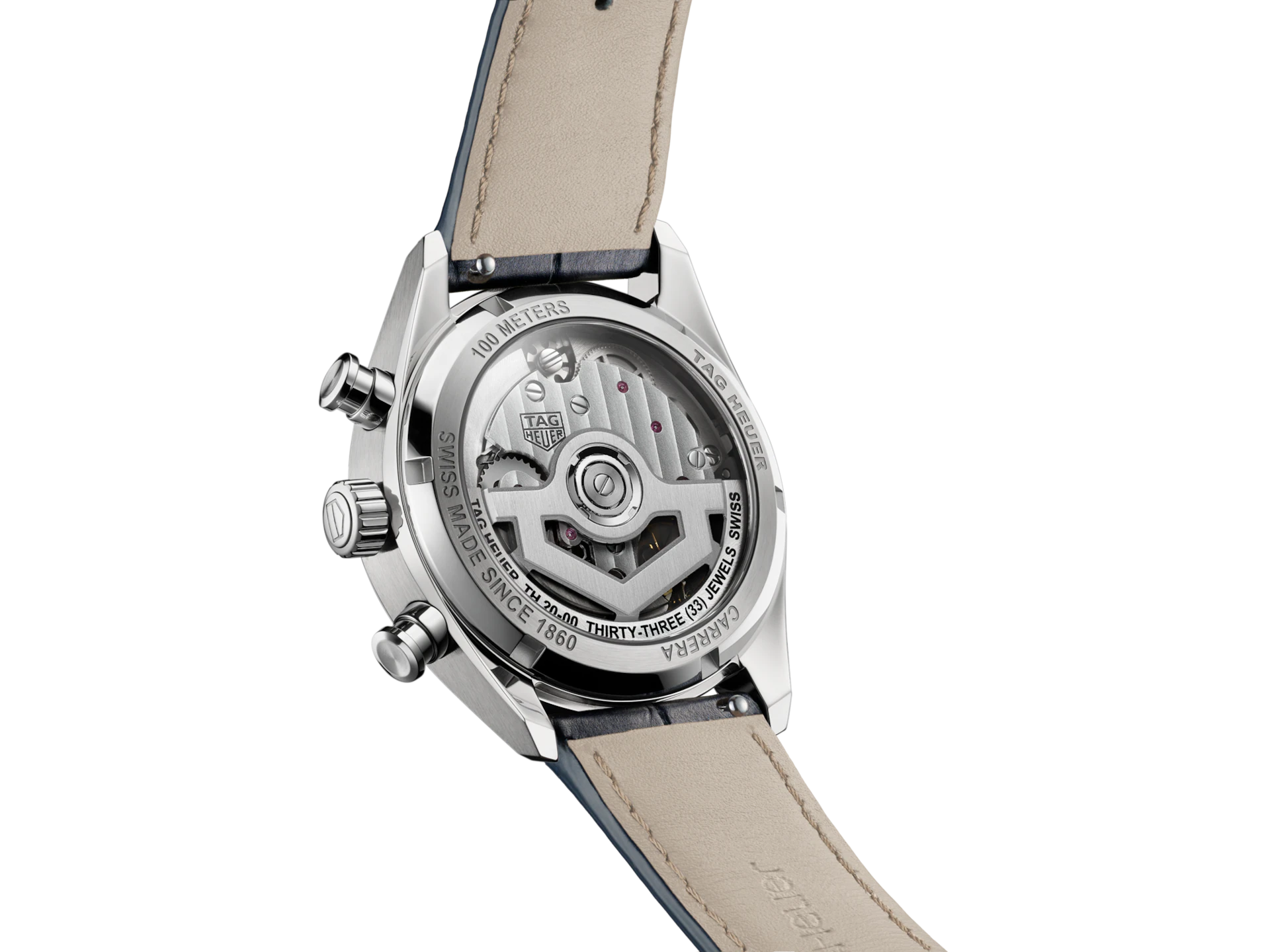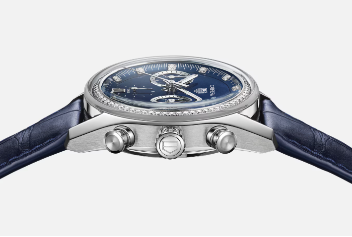 De blauwe, cirkelvormige, geborstelde wijzerplaat van de TAG Heuer Carrera CBS2214.FC6567 is een canvas voor 72 sprankelende diamanten op de flange en 11 chaton-gezette diamanten uur markeringen, die een visie van delicate elegantie creëren.