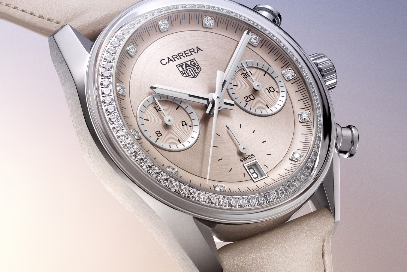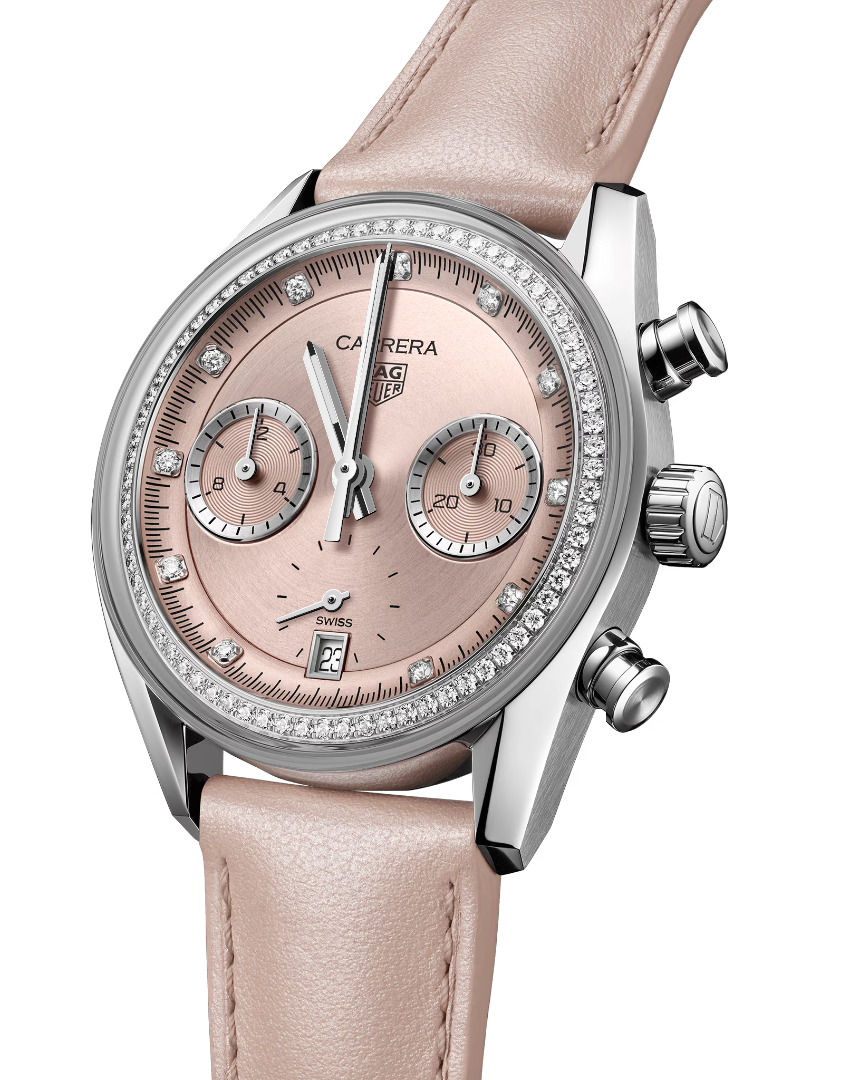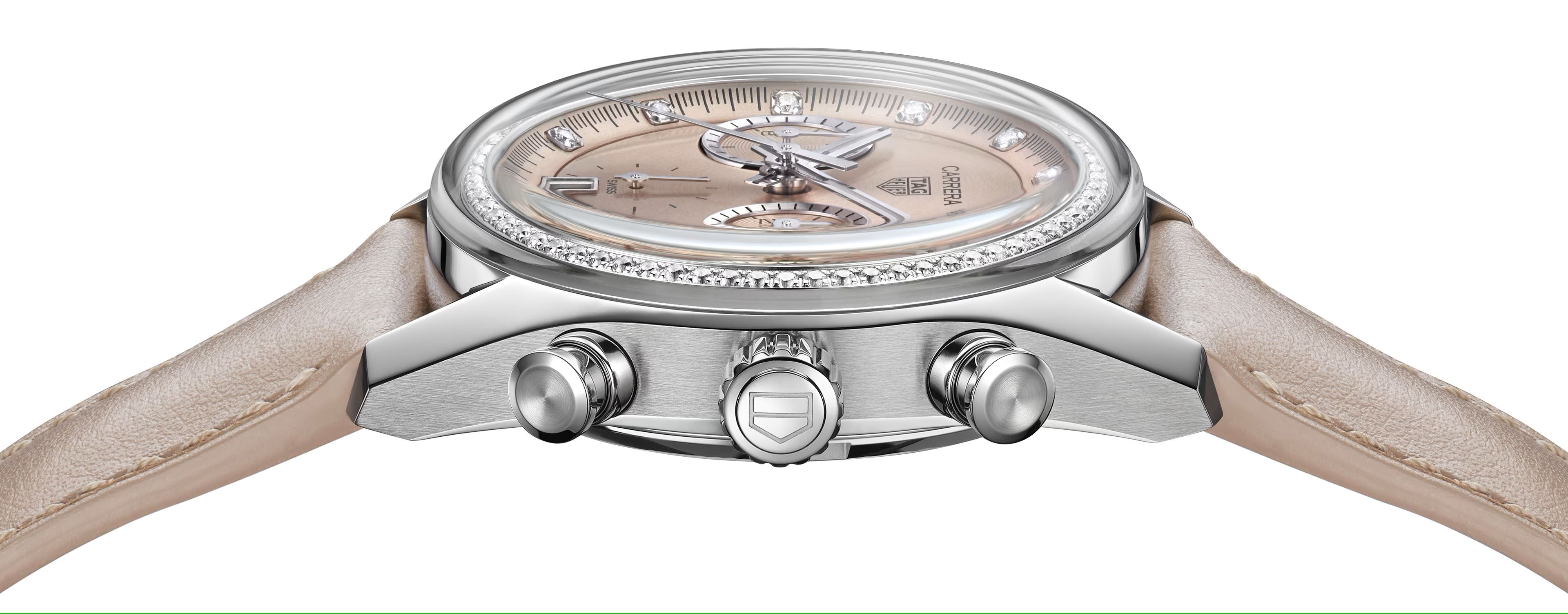 Met zijn silhouet vangt dit TAG Heuer Carrera uurwerk chronograaf de essentie van vrouwelijkheid en race spirit. Met een zachtroze wijzerplaat, afgezet tegen de schittering van diamanten, straalt het een luxueuze, sportieve esthetiek uit.