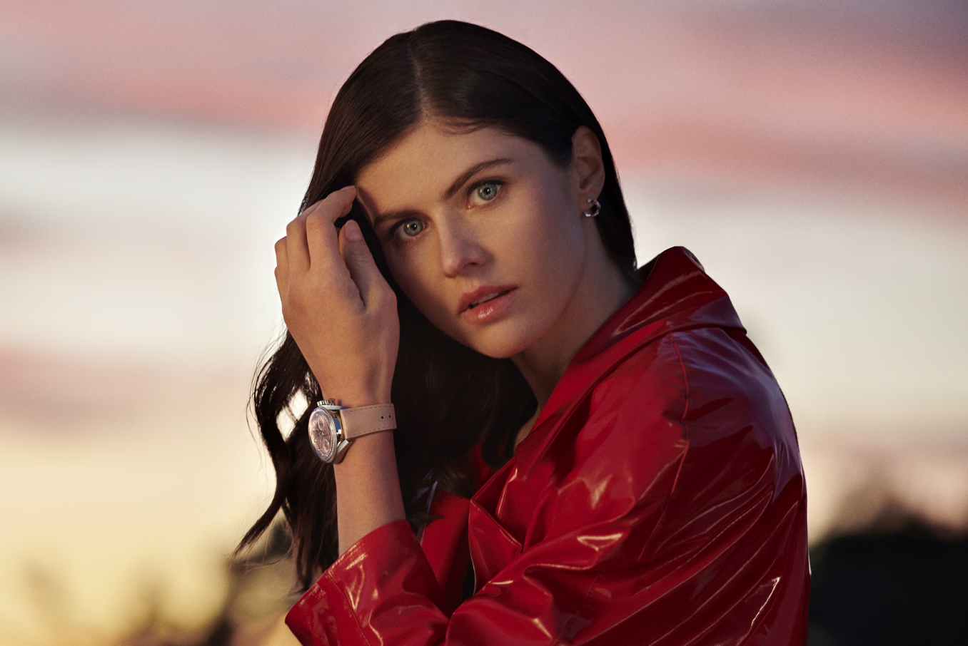 De subtiele, poederroze wijzerplaat is gedetailleerd met een met 72 diamanten gezette flange en met chaton gezette diamanten indexen en biedt een delicate maar nauwkeurige tijdwaarneming.