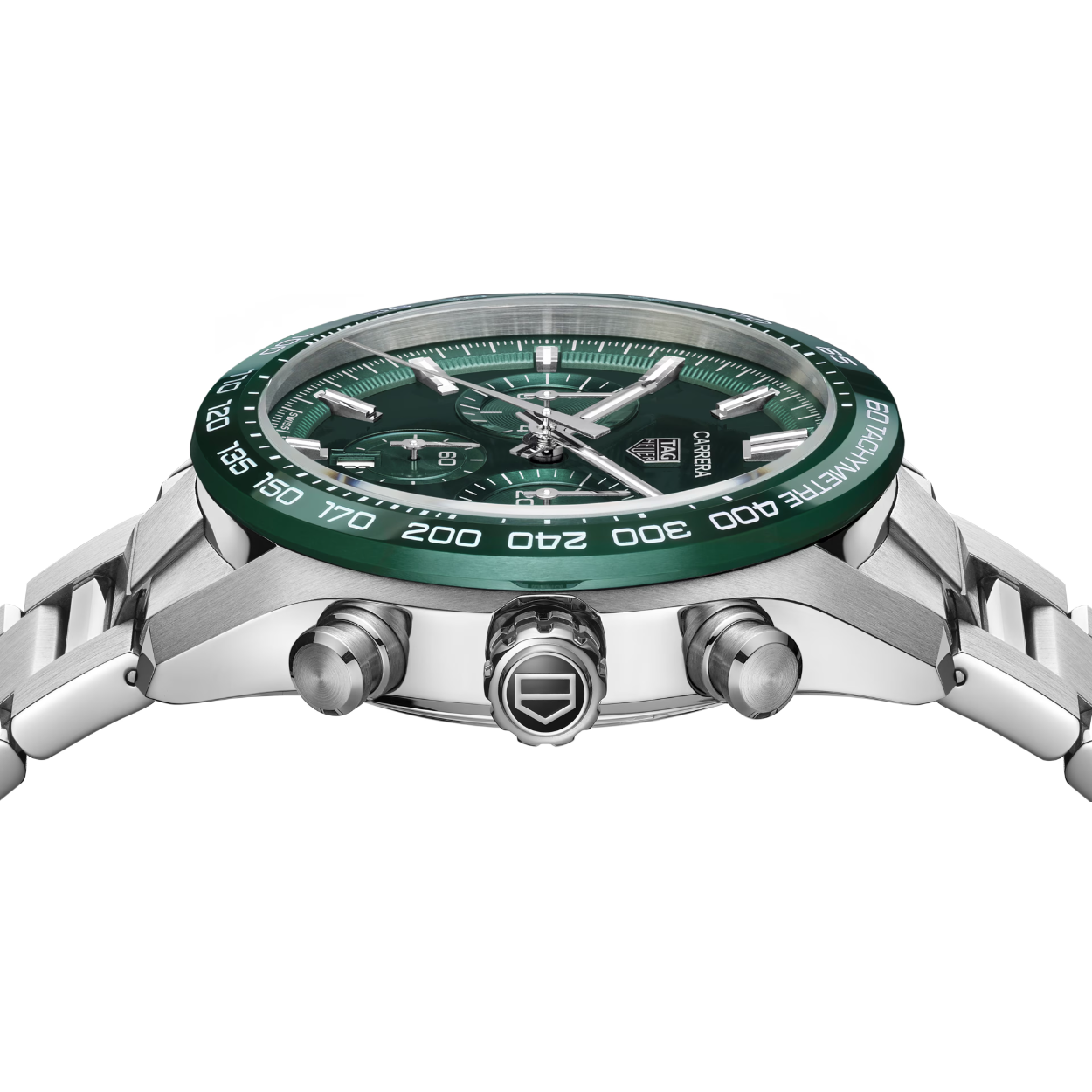 Dit ronde, klassieke TAG Heuer carrera horloge krijgt een trendy allure met een opvallende groene wijzerplaat en bijpassende keramische bezel. Het Sportieve ontwerp en monochrome kleurenschema dragen bij aan de aantrekkingskracht van dit avontuurlijke horloge.