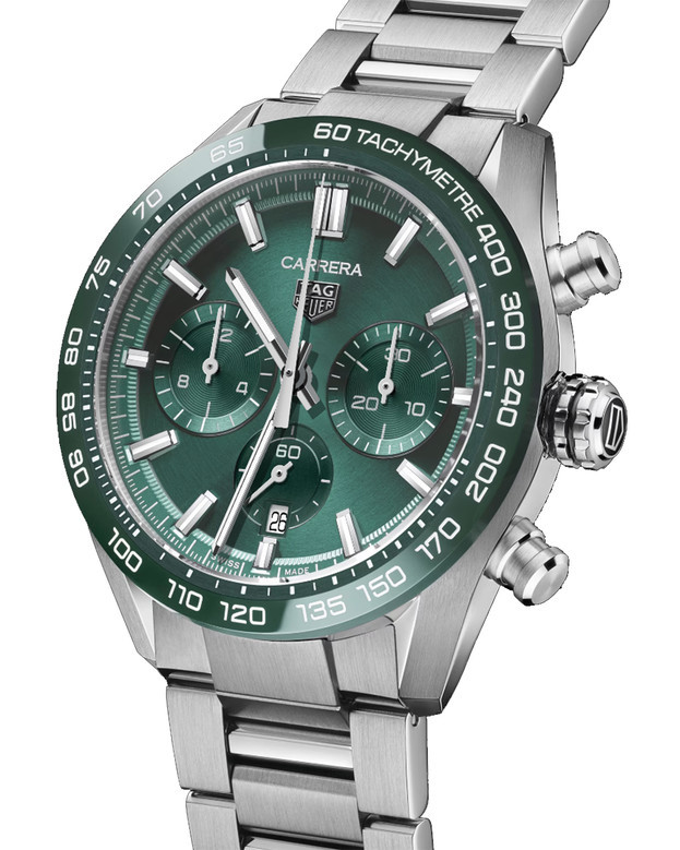 De ronde, geborstelde wijzerplaat en de bijpassende vastebezel met tachymeter, gedrapeerd in intens groen, zorgen ervoor dat de gerhodineerde wijzers en indexen prachtig opvallen.