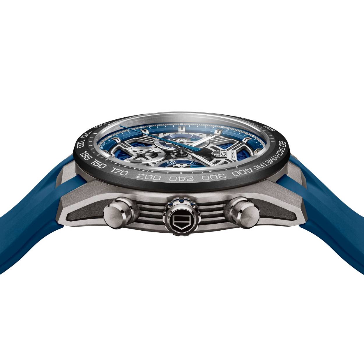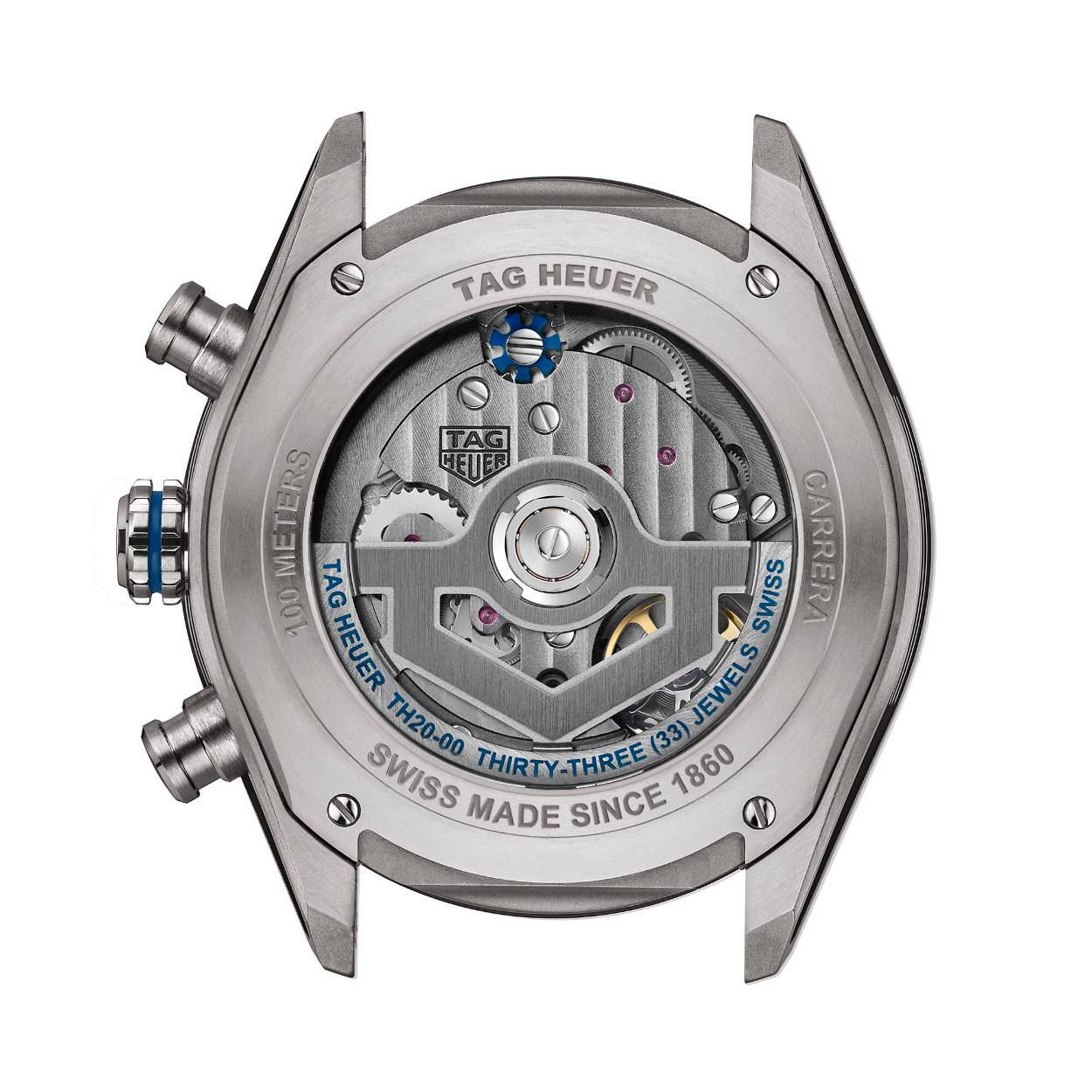 Gesmeed in titanium klasse 2 en geaccentueerd met een zwarte PVD uitgeholde zijkant, is de 44 mm kast een fort voor het ingewikkelde TH20-00 in-house uurwerk, zichtbaar door de achterkant van de kast.