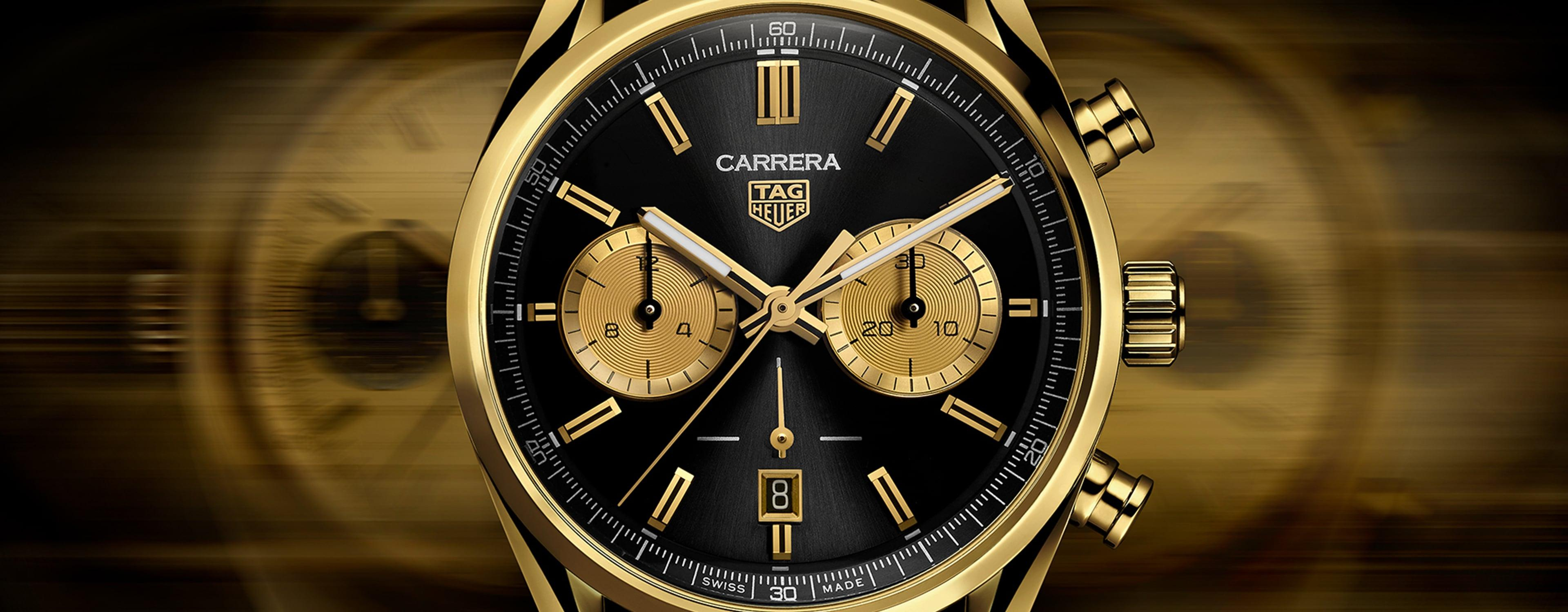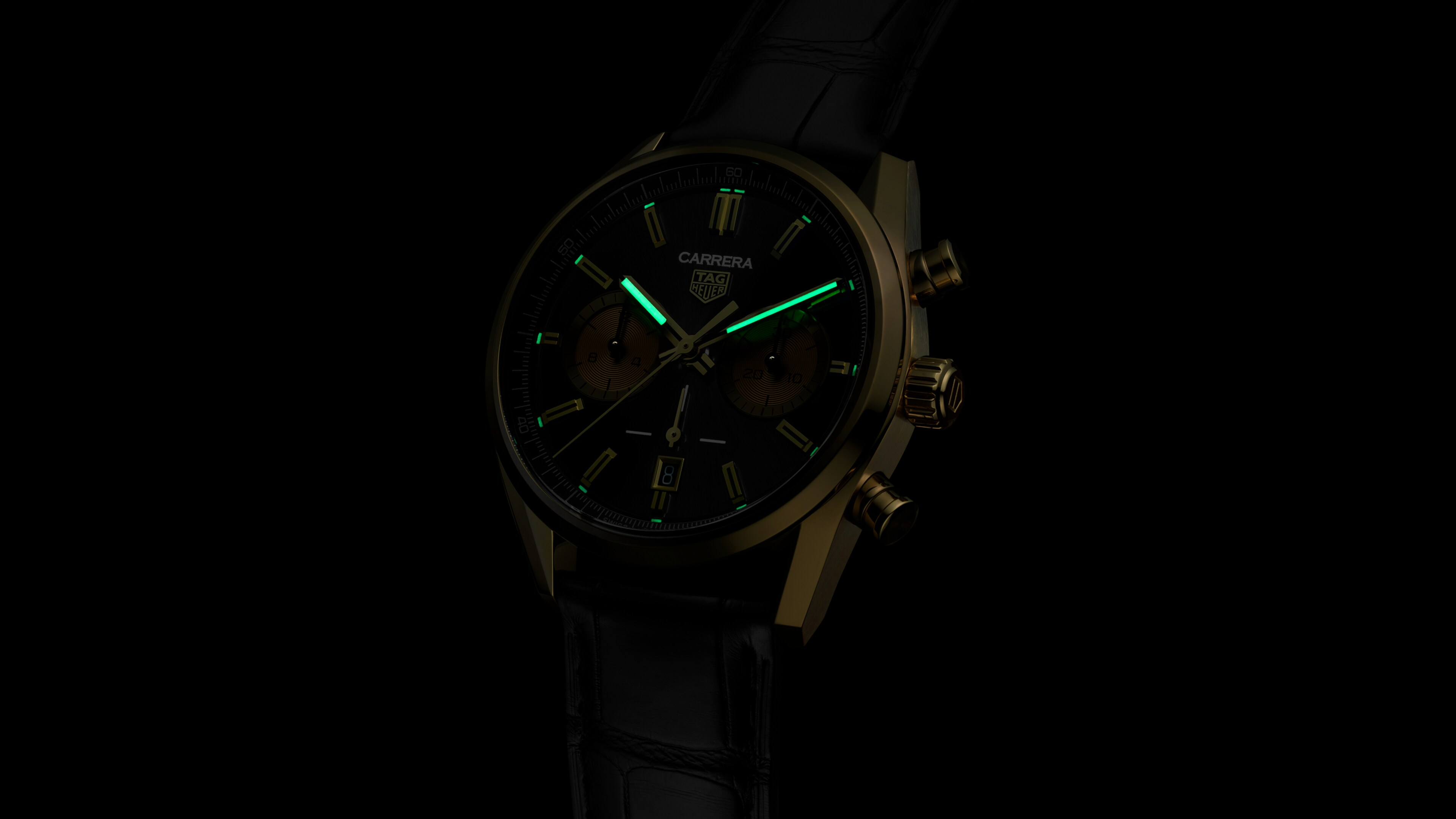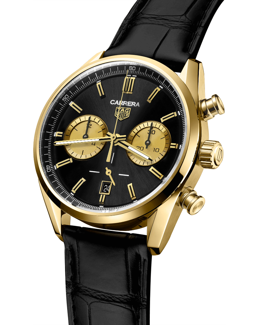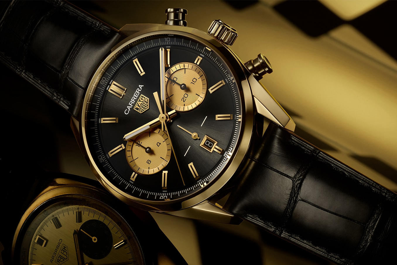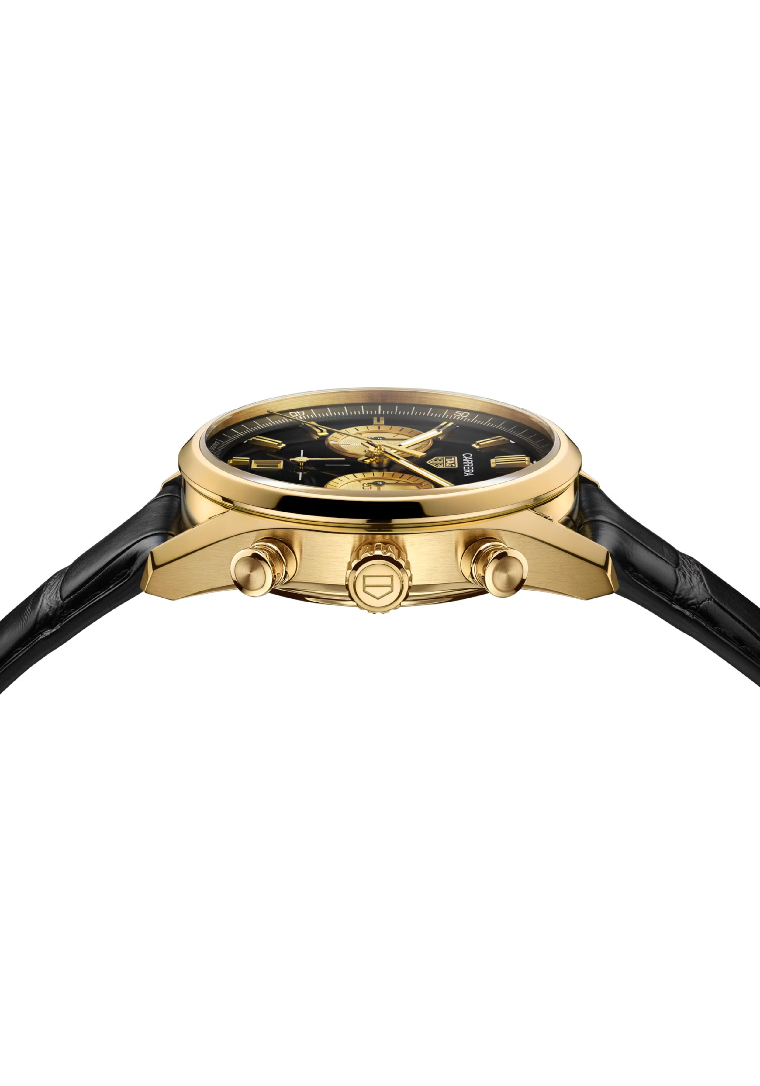 Deze TAG Heuer Carrera Chronograaf, uitgevoerd in prachtig zwart en 18-karaats 3N geelgoud, is geïnspireerd op een iconische racekleurstelling en versterkt de connectie van de collectie met de autosport.