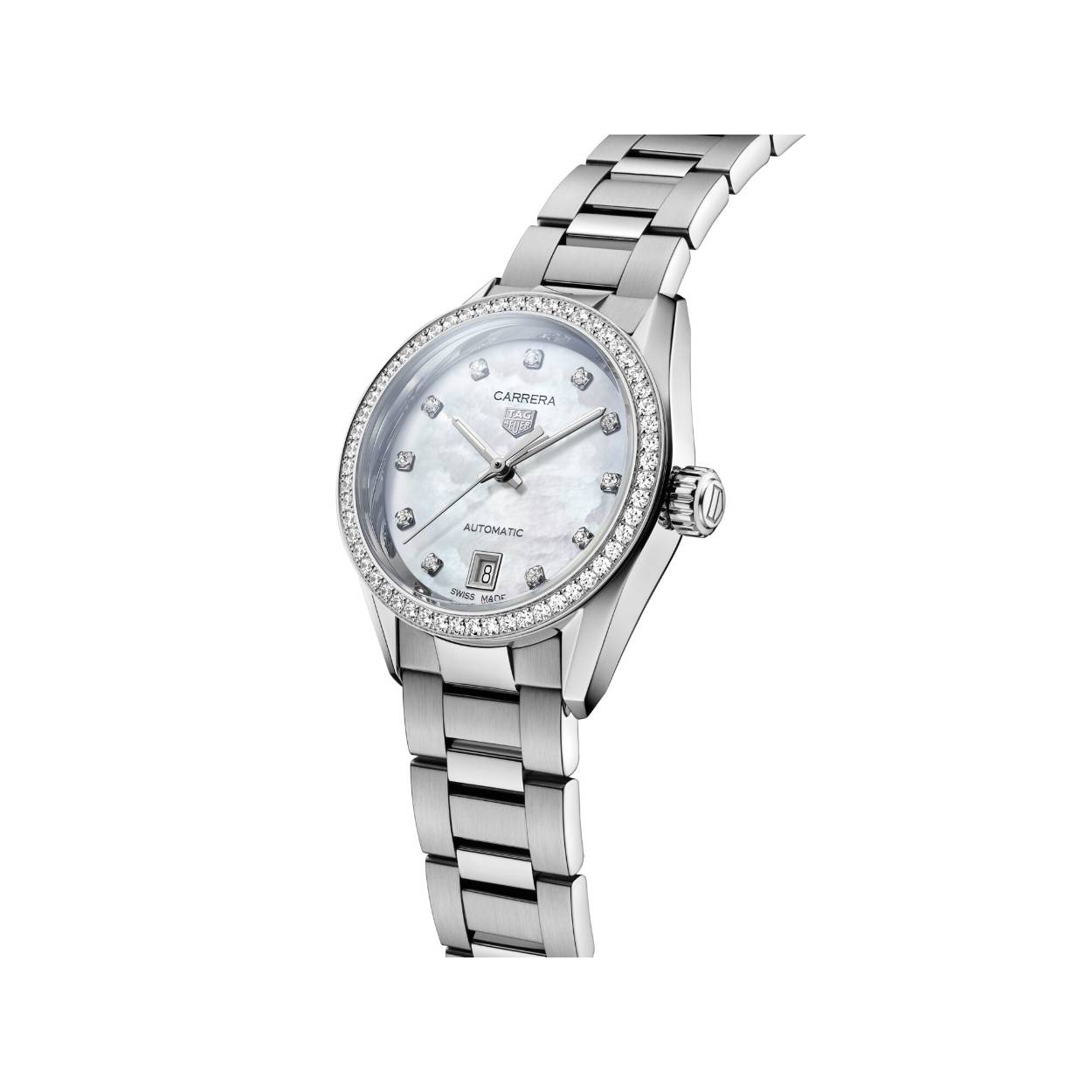 De elegante parelmoeren wijzerplaat wordt aangevuld met 11 diamanten met een diameter van 1,30 mm (0,088 ct) indexen en een luxe gepolijste stalen bezel met 56 diamanten met een diameter van 1,40 mm (0,544 ct).