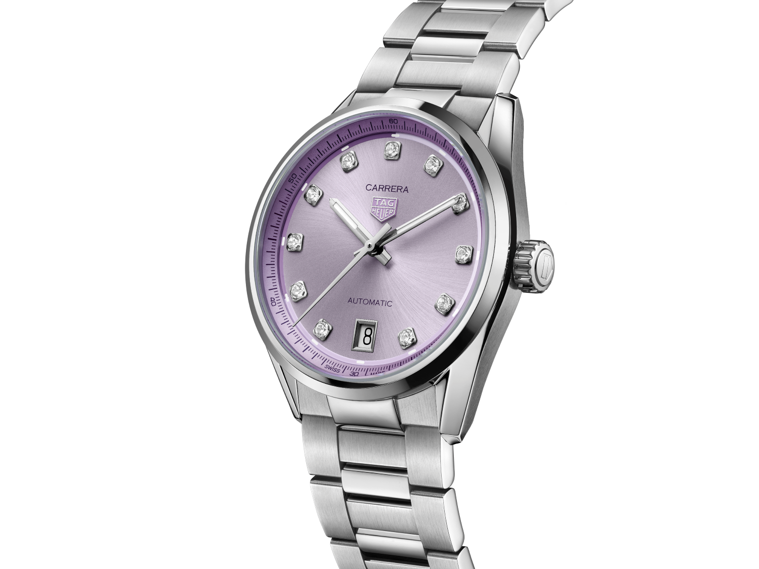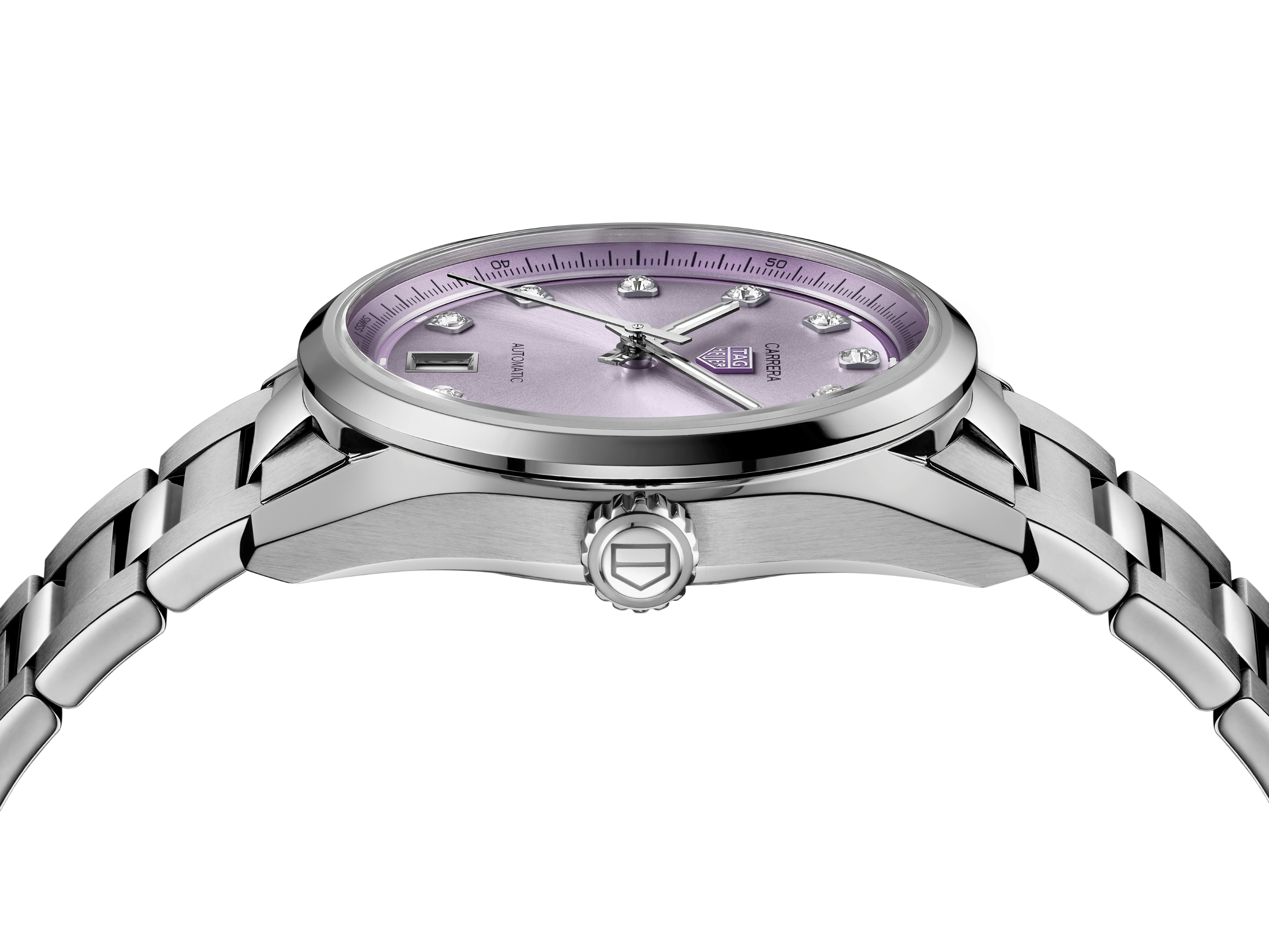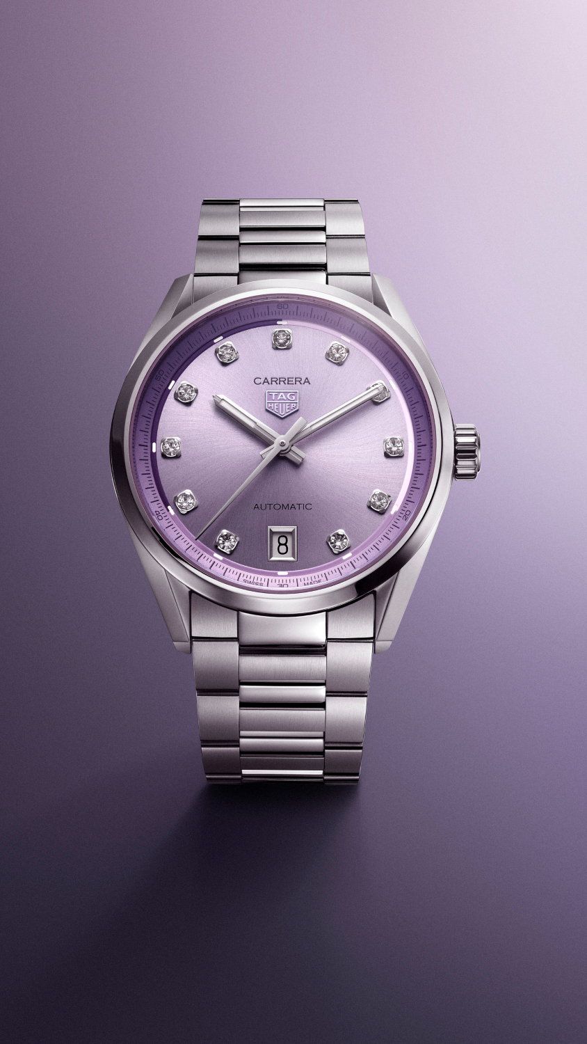 De TAG Heuer Carrera Date in 36 mm geeft de collectie een frisse touch met een betoverende lila wijzerplaat. Met diamanten bezette indexen en een Calibre 7-uurwerk combineert dit horloge elegantie met precisie.