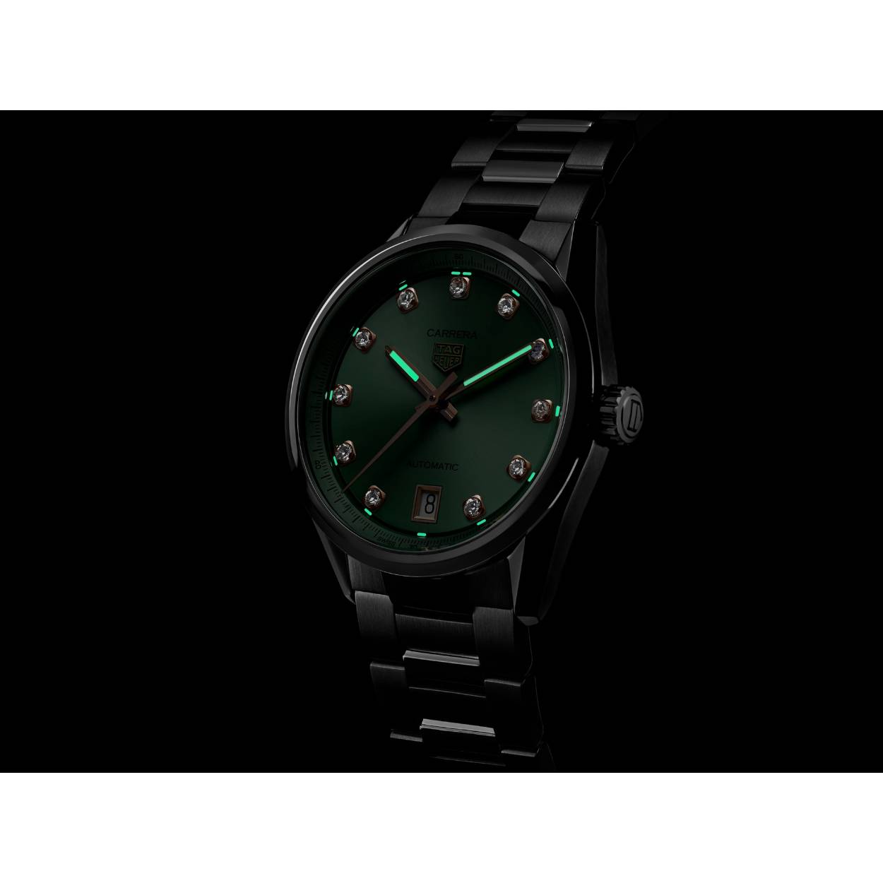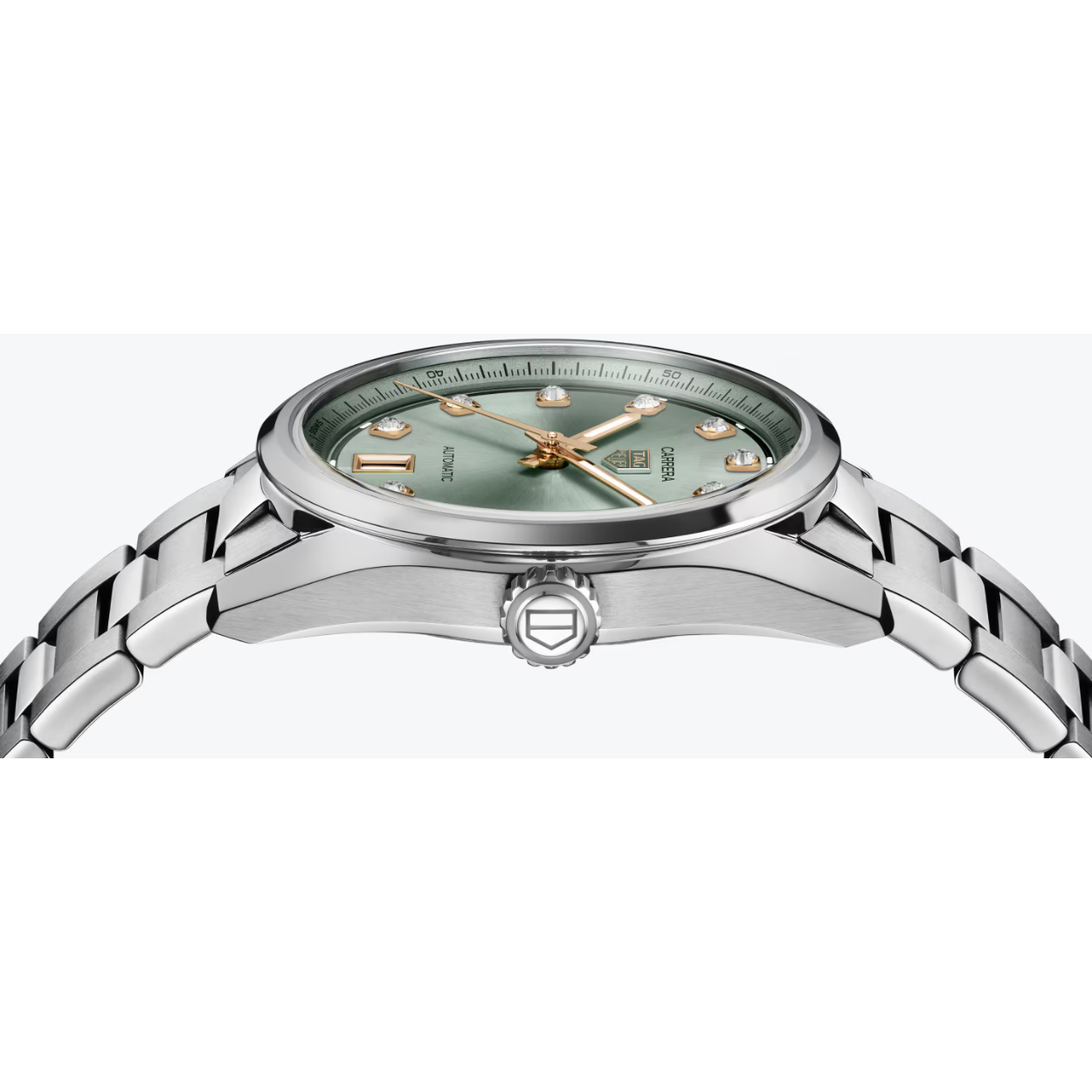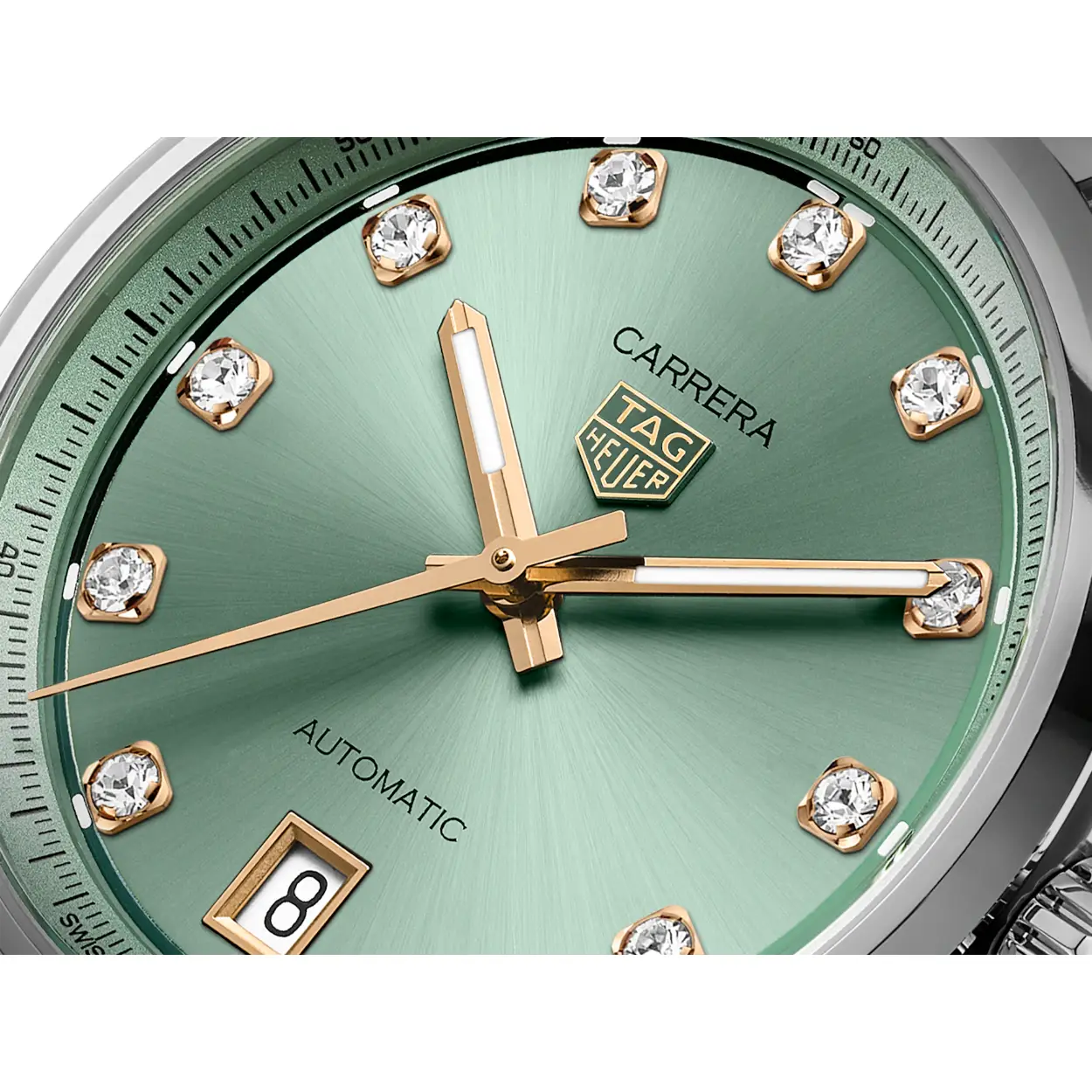 De ingetogen, pastelachtige groene wijzerplaat schitteren 11 VS-diamanten die de visuele aantrekkingskracht verrijken met een vleugje weelde. De diamanten indexen worden perfect aangevuld door 18K 5N roségoud vergulde accenten, deze combinatie zorgt voor een verfijnde look. De gefaccetteerde uur- en minutenwijzers, gecoat met witte SuperLuminova® zorgen voor een leesbaarheid bij weinig licht, wat de bruikbaarheid van dit verbluffende stuk vergroot.