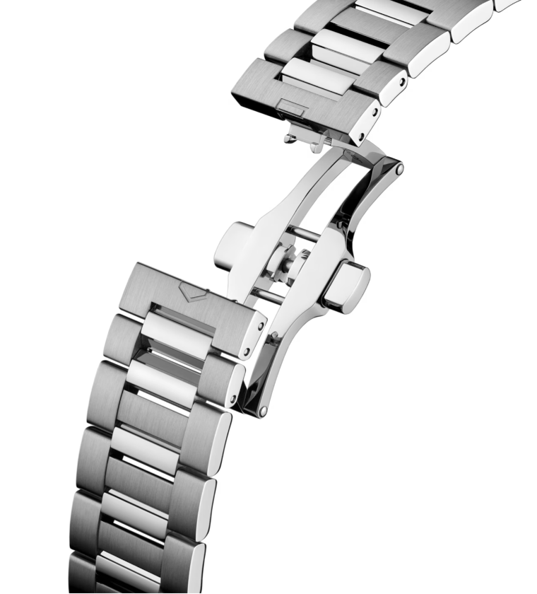 De drierijige, H-vormige armband biedt naadloze aanpassing met eenvoudig te verwijderen schakels, wat zorgt voor een perfecte pasvorm. De vouwsluiting met dubbele veiligheidsdrukknoppen zorgt voor een veilige en strakke afwerking.