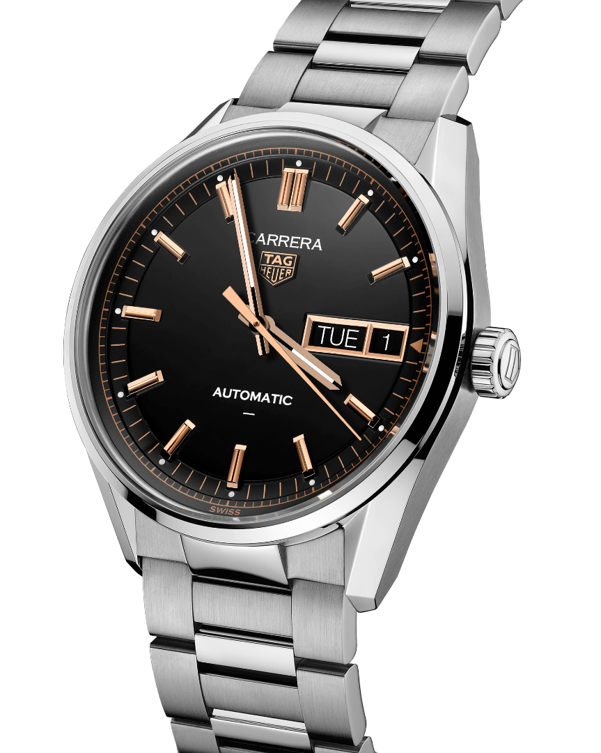 Verfijn uw stijl met de TAG Heuer Carrera Day-Date, met een fijn geborstelde stalen kast van 41 mm en een verfijnde zwarte opaal wijzerplaat met contrasterende 18K 5N roségouden accenten. Aangedreven door het TH31-02 uurwerk, is dit horloge een voorbeeld van precisie en elegantie.