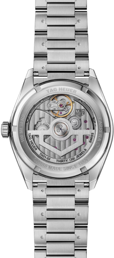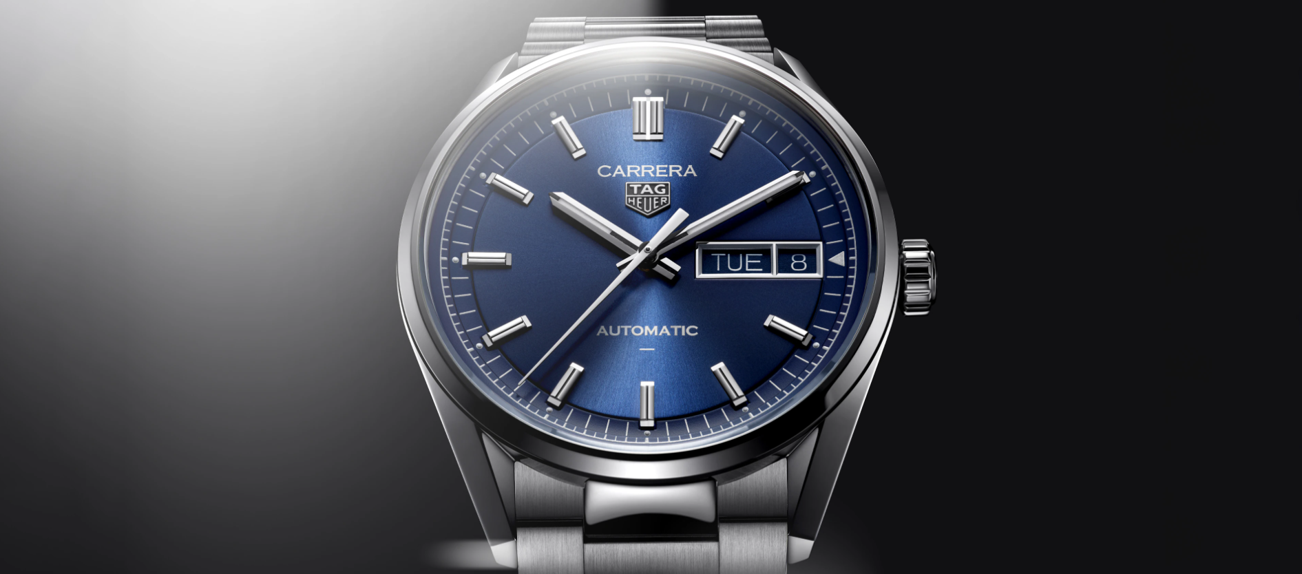 De blauwe sunray-geborstelde wijzerplaat valt op door zijn levendige toon, versterkt door rhodium-geplateerde wijzers en indexen. De licht gebogen flens voegt een verfijnde toets toe aan het tijdloze TAG Heuer Carrera-ontwerp. De symbolische Victory Wreath, gegraveerd op de achterkant van de kast, eert de motorsporterfenis van TAG Heuer en is een eerbetoon aan historische, zegevierende racers die Carrera-horloges dragen.