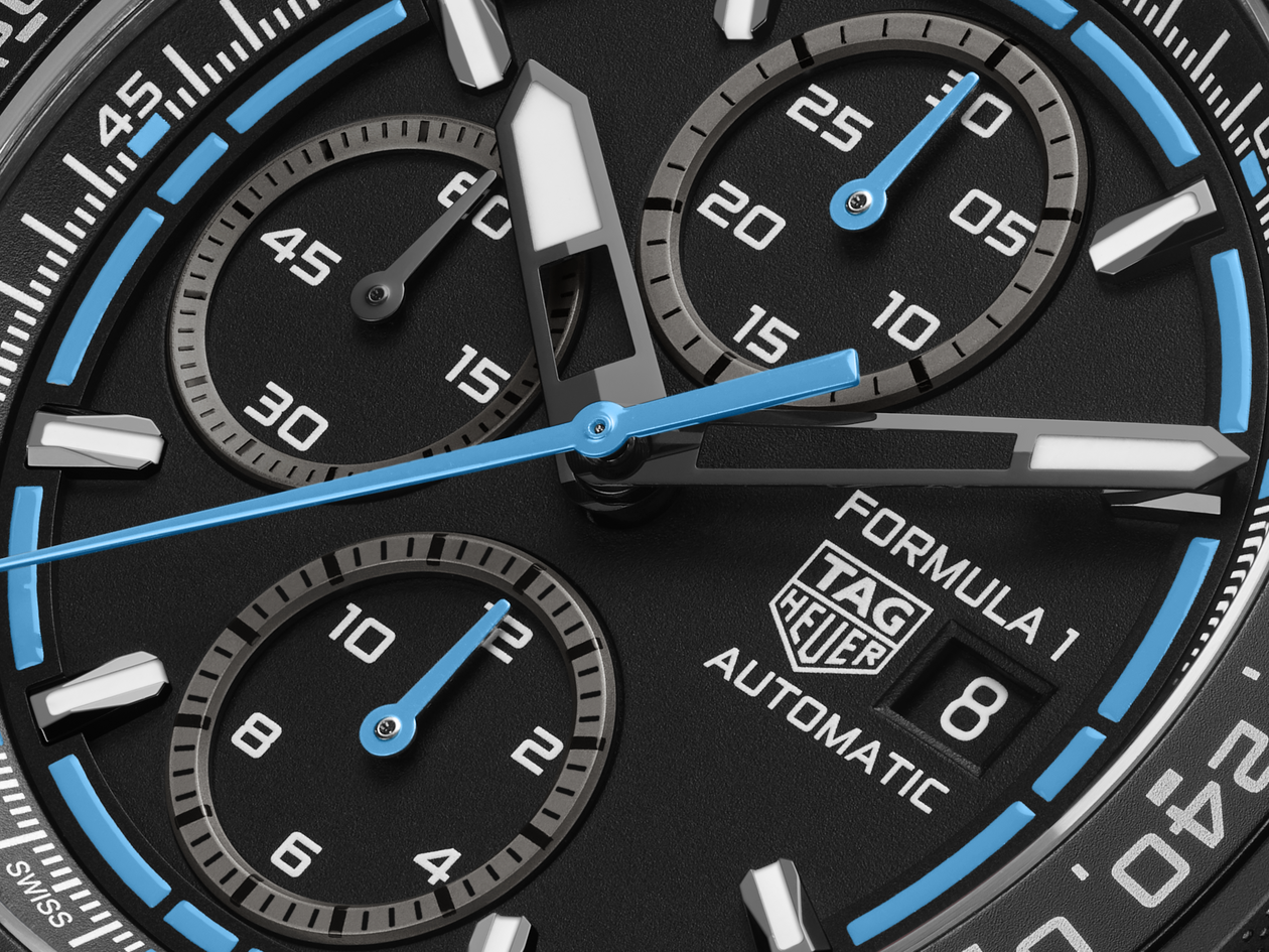 De zwarte opaal wijzerplaat heeft een opvallende blauwe lakbaan, wat een vleugje levendigheid toevoegt. De Super-LumiNova®-aangebrachte wijzers en indexen zorgen voor optimale leesbaarheid, terwijl de tachymeter bezel de race-esthetiek versterkt.