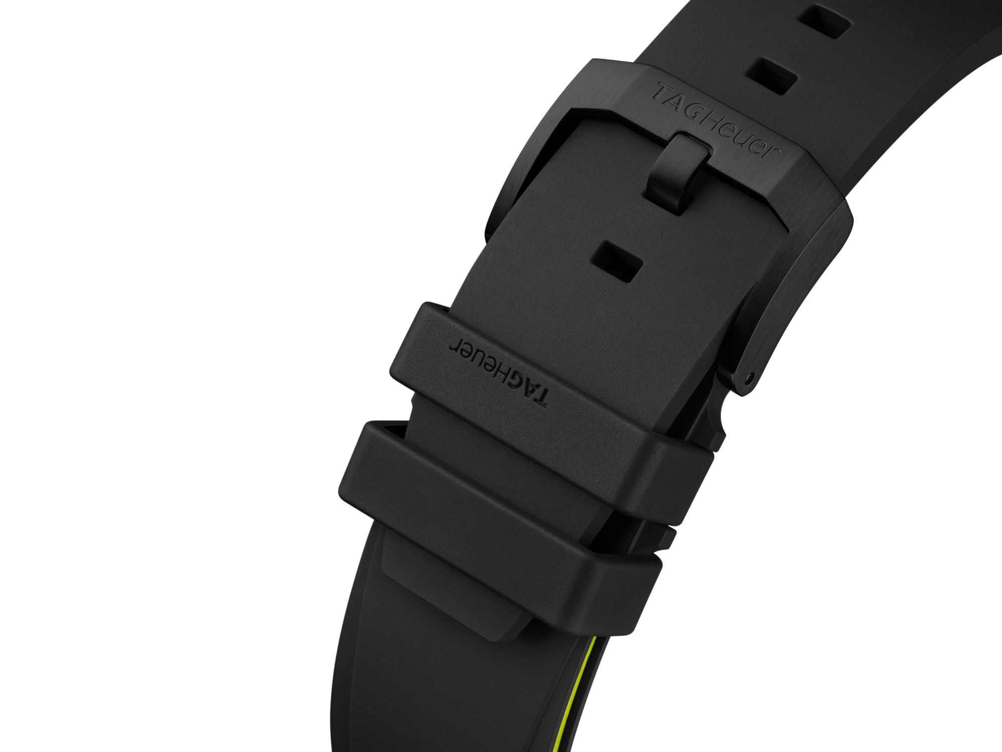 De zwarte opaal wijzerplaat is omgeven door een limoenkleurige gelakte rand, wat het horloge een frisse, moderne uitstraling geeft. Lichtgevende wijzers en indexen zorgen voor afleesbaarheid overdag en 's nachts, terwijl de tachymeterring de race-roots van het horloge benadrukt.