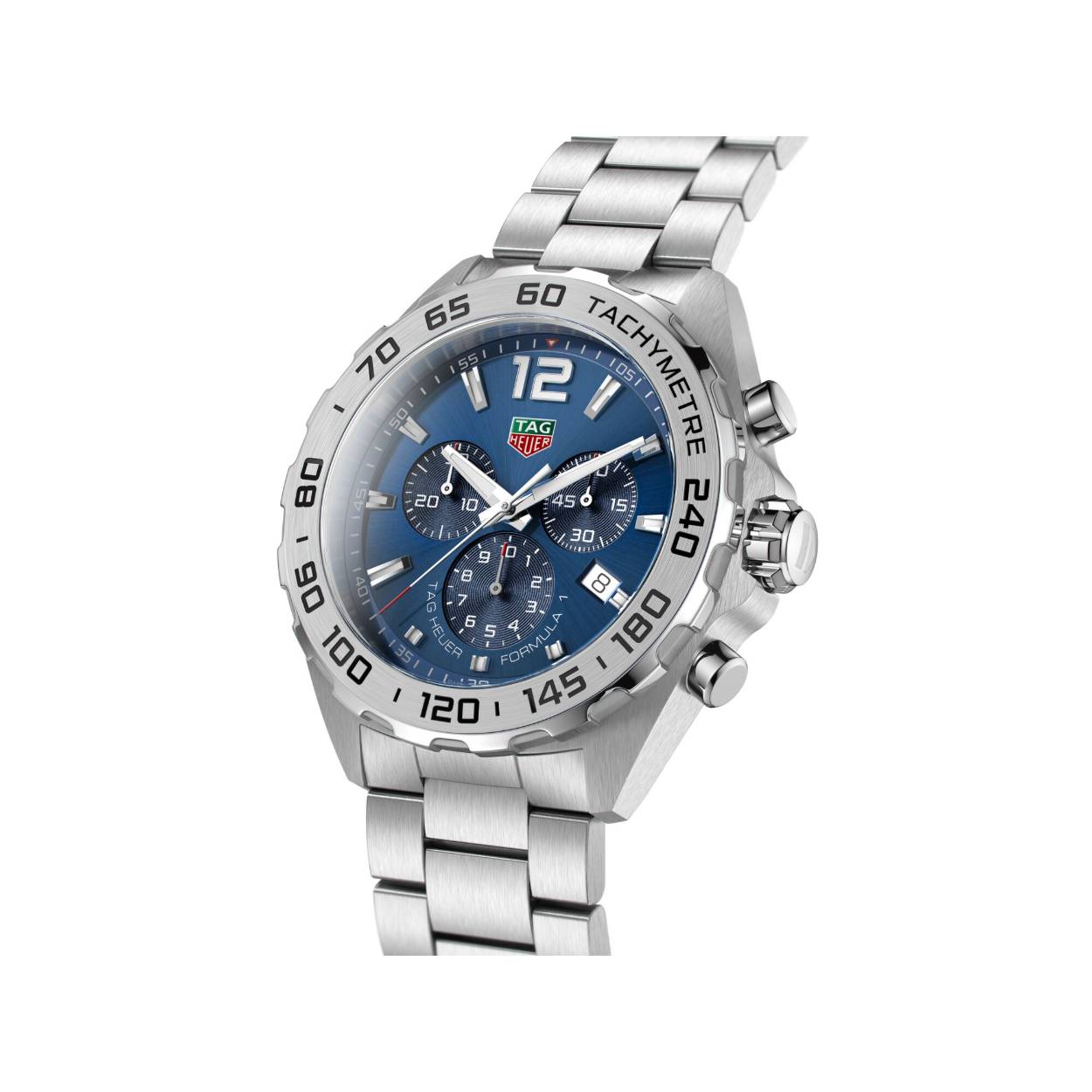 De klassieke stalen en blauwe TAG Heuer Formula One. Schuine datumopening om 4 uur. Tachymeter vaste ring met grote zwarte Arabische cijfers, afwisselend afgewerkt. Een 43 mm tonneau-vormige kast van geborsteld staal.