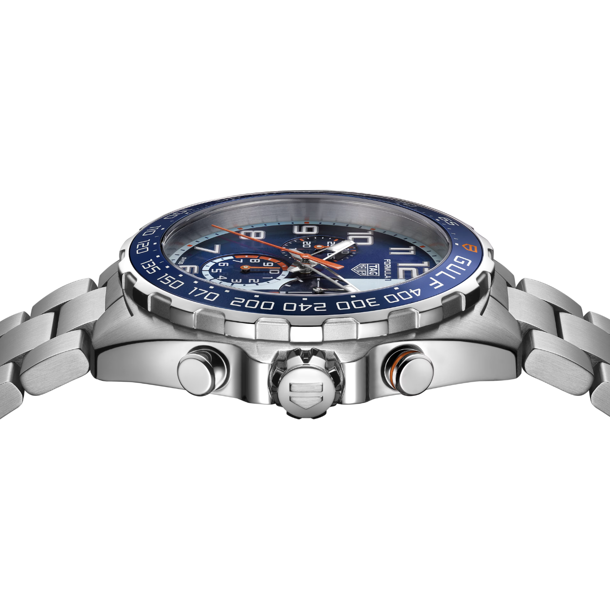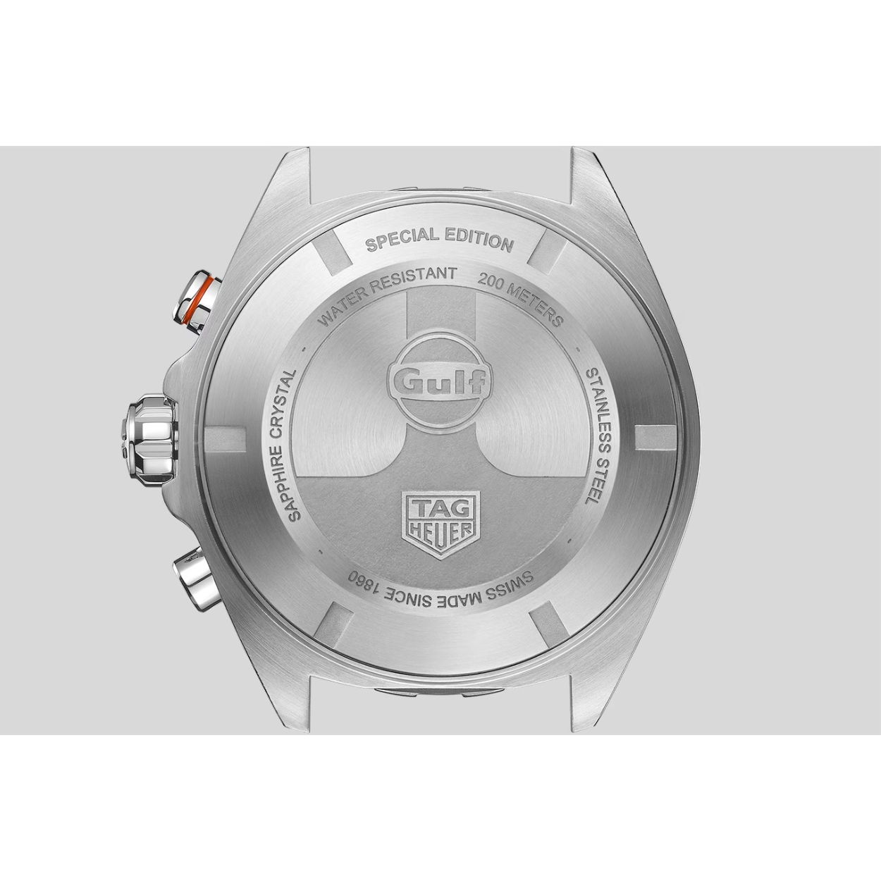 Vet en energiek, deze chronograaf maakt een blijvende indruk van de legendarische samenwerking tussen TAG Heuer en Gulf. Het racen geïnspireerde horloge heeft het iconische blauw en oranje van Gulf en is klaar om met stijl te overwinnen. Met een diameter van 43 mm is dit horloge perfect voor de liefhebber van racesport. Daarnaast is dit horloge voorzien van een quartz uurwerk en een edelstalen band.
