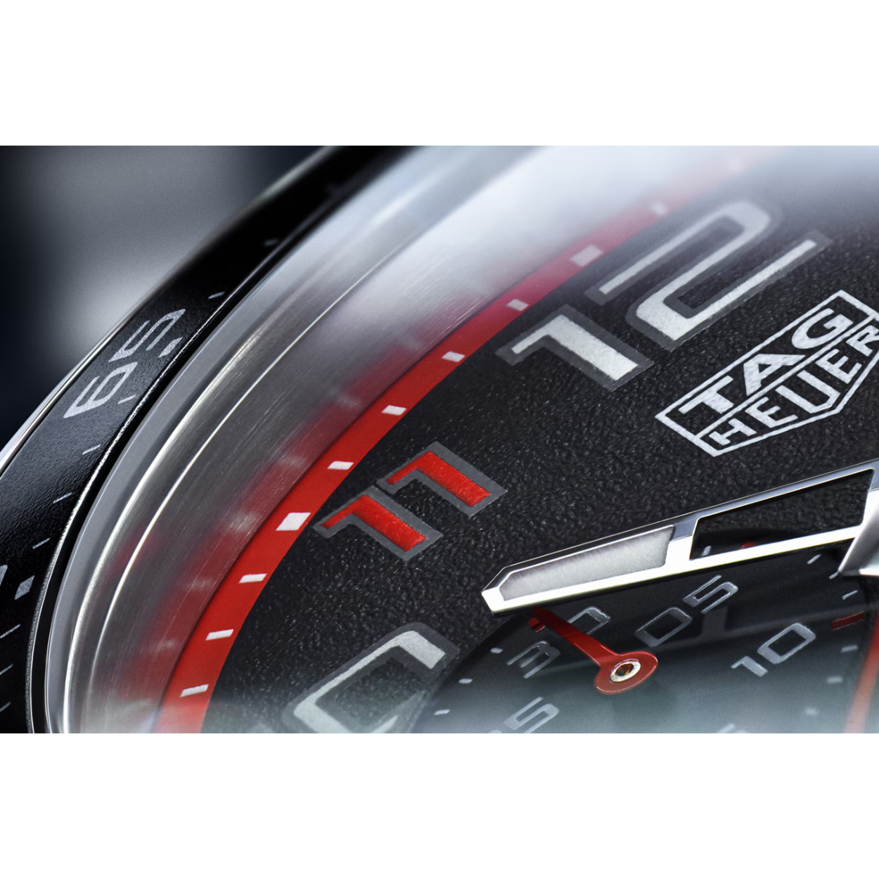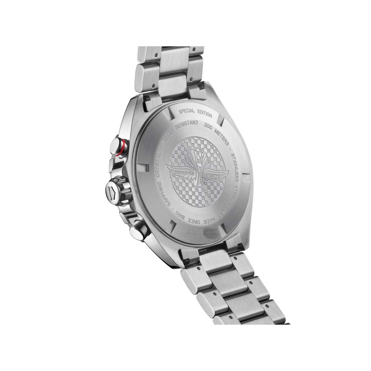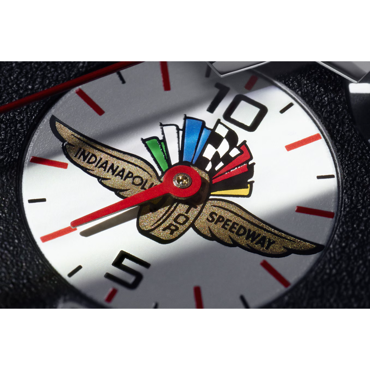 De zwartkorrelige wijzerplaat valt op door zijn kenmerkende arabische indexen en de opvallende rode accenten. Op de 6 uurs subwijzerplaat van de chronograaf is het iconische Indy 500 logo afgebeeld. De stalen kast straalt zijn race-DNA uit met zijn rood gelakte 2-uur-drukker en het mythische 'wings and wheels'-logo gegraveerd op de vastgeschroefde achterkant van de kast.