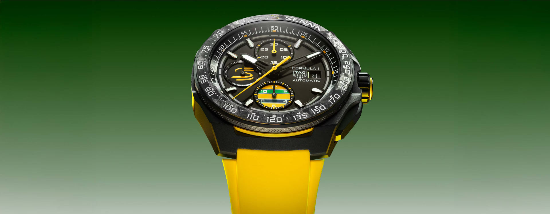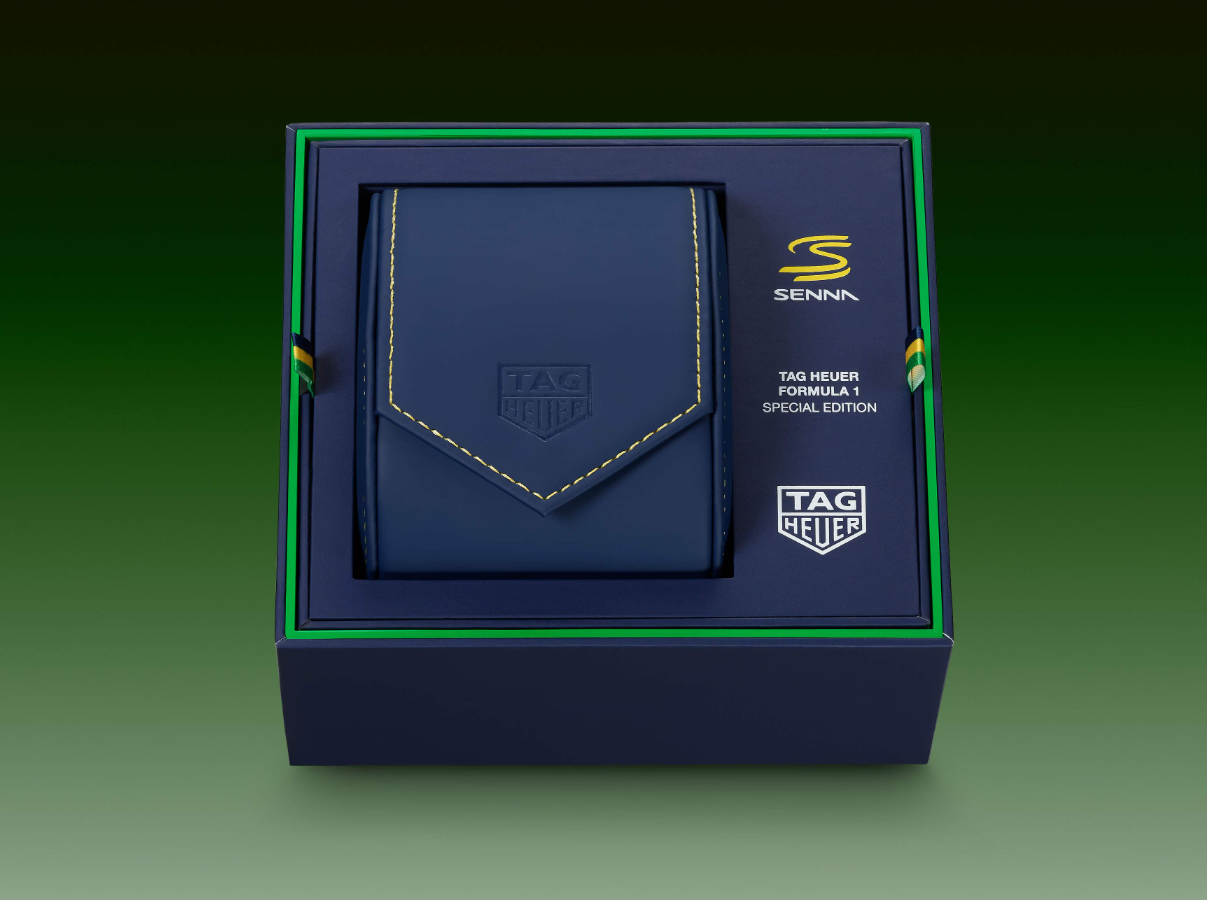 Deze speciale editie behuizing combineert diepblauw met groene en gele details — een knipoog naar de helm-livery van Ayrton Senna. Het bijpassende reisetui, met het TAG Heuer schild in reliëf en gele stiksels, maakt dit eerbetoon aan een legende van snelheid en uithoudingsvermogen compleet.
