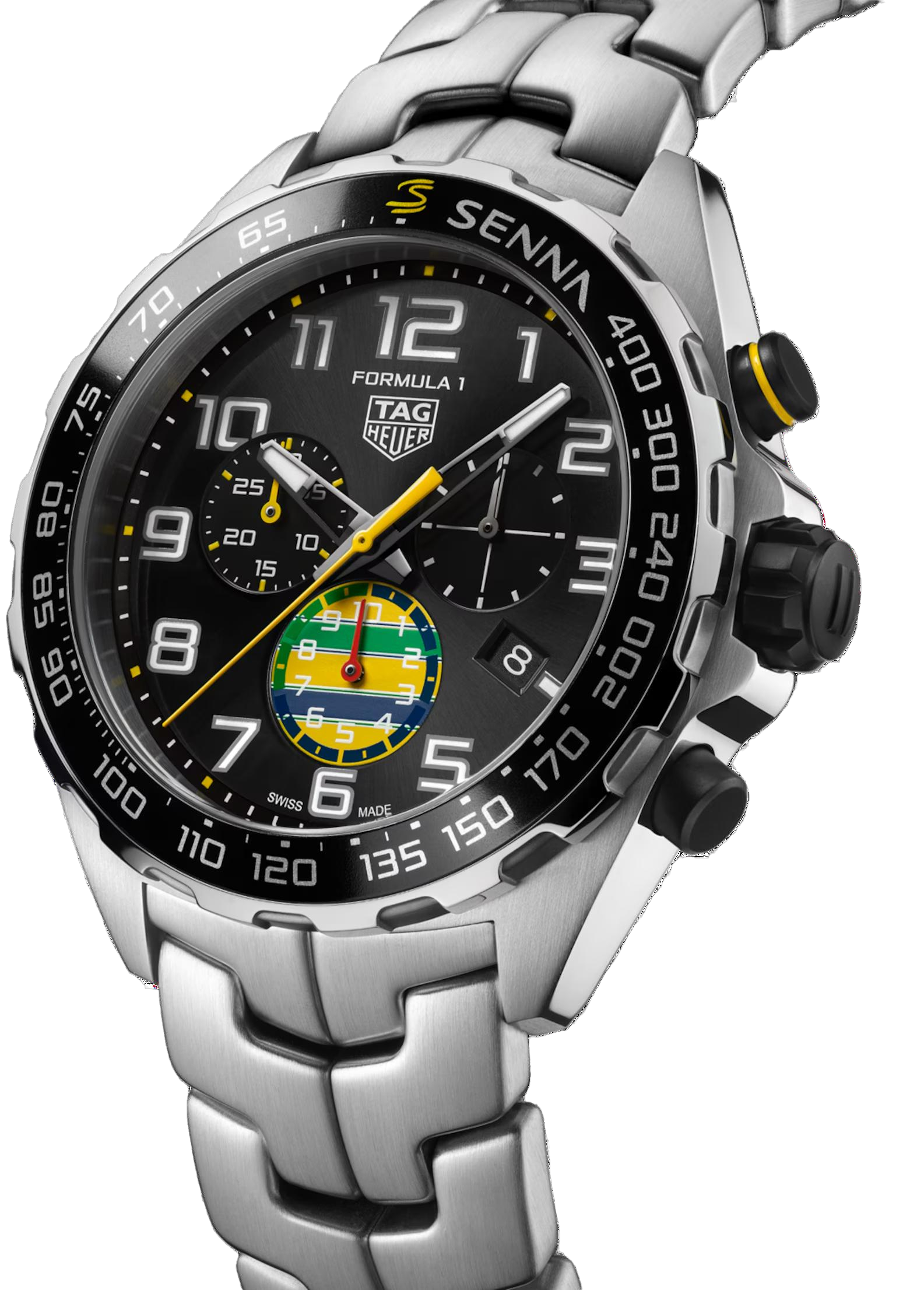 De zwarte sunray-geborstelde wijzerplaat, met gele, rode, groene en blauwe accenten op de 1/10e seconde chronograaf teller op 6 uur, weerspiegelt de iconische kleuren die geassocieerd worden met Senna’s buitengewone race-erfgoed.
