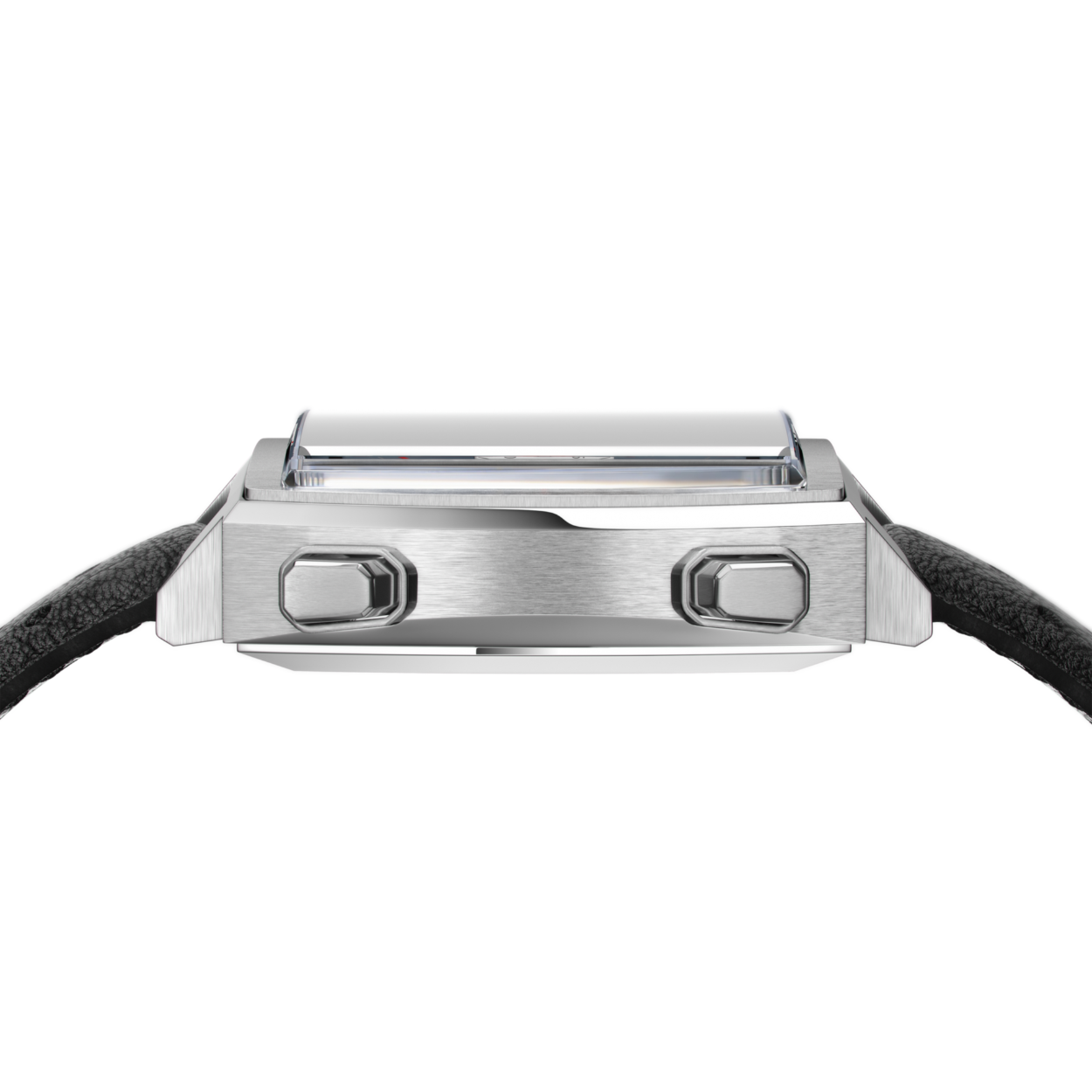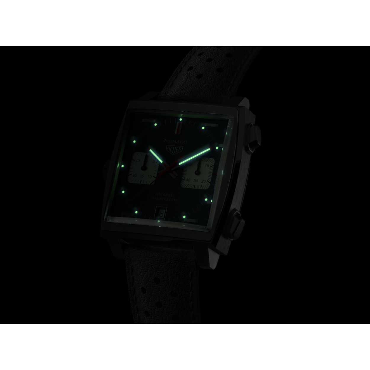 De ultieme race ‘touch’ wordt geleverd door de serieus stijlvolle horlogeband: zwart kalfsleer met een speciale afwerking, geïnspireerd op racebaanasfalt.