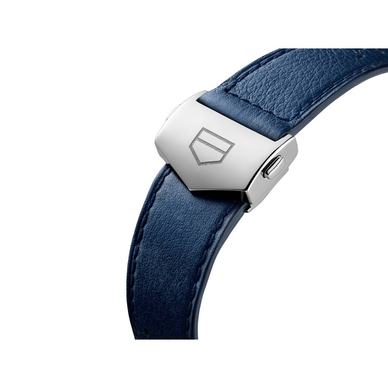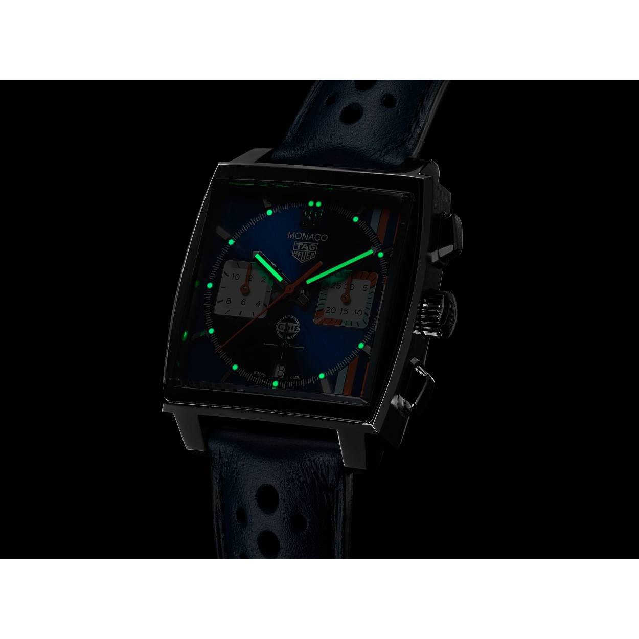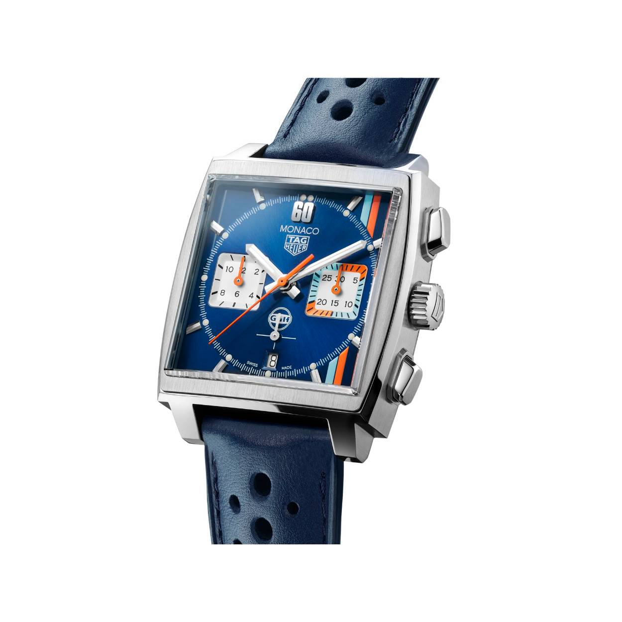 Deze legendarische speciale editie TAG Heuer Monaco is fel versierd met de charismatische kleurstelling van het merk Gulf. Trouw aan zijn nonchalante geschiedenis, toont de blauwe sunray brush-wijzerplaat iconische dunne Gulf-strepen en -logo om 6 uur, en een vintage TAG Heuer-logo om 12 uur. Een geperforeerde blauwe kalfsleren band past bij de mythische blauwe wijzerplaat. De stalen vouwsluiting is voorzien van dubbele veiligheidsdrukknoppen en het TAG Heuer schild.