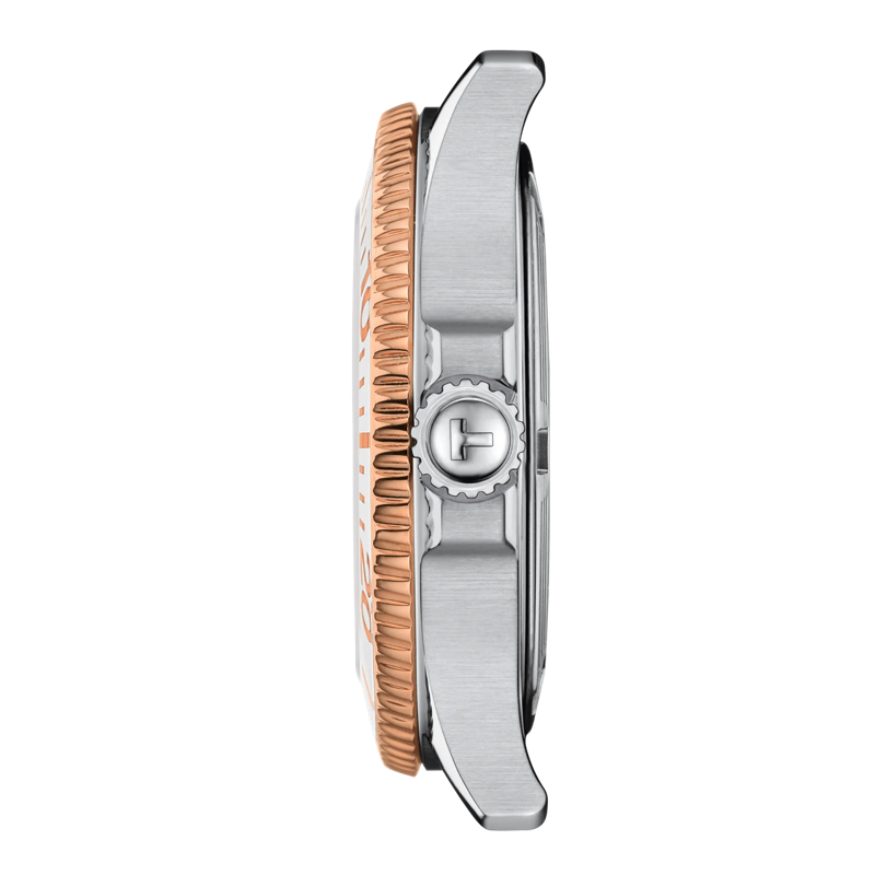 De Tissot is voorzien van een quartz kaliber 10 1/2'" uurwerk. De kast en band zijn gemaakt van roestvrijstaal met een rosegouden pvd-coating. Het horloge heeft een diameter van 40 mm en is getest op een waterdichtheid tot 30 atm / 300 m, het horloge is hierom uiterst geschikt als duikershorloge. De wijzers en indexen zijn voorzien van Super-LumiNova®️ waardoor de blauwe wijzerplaat ook in het donker goed af te lezen is. Het horloge heeft een krasvrij saffierglas met antireflecterende coating.
