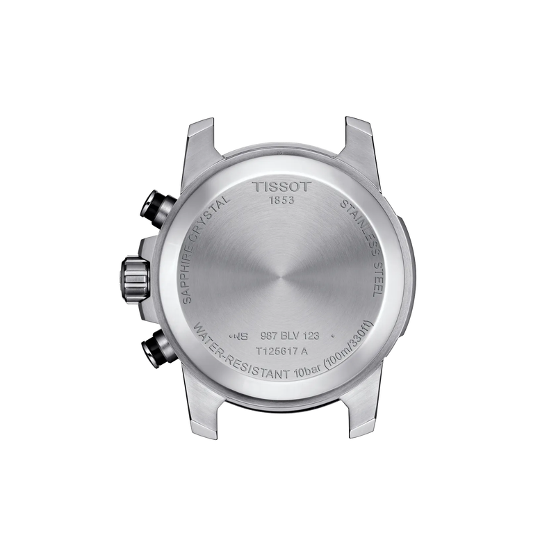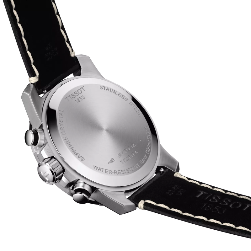 De Tissot Supersport Chrono Collectie is perfect voor de moderne man die zijn horloge in het dagelijks leven, op kantoor en bij sportevenementen wil dragen. De strakke lijnen in combinatie met de indrukwekkende 45,5 mm kast geven de Tissot Supersport Chrono een sterke persoonlijkheid. De grote kroon, die zorgt voor een betere grip, heeft een extra kroonbescherming. De forse indices met SuperLuminova®-coating en de asymmetrische applicaties op de wijzerplaat zorgen voor een krachtig 3D-effect, een dynamische uitstraling en zorgen voor een ideale leesbaarheid in het donker. Daarnaast is deze collectie verkrijgbaar een compleet assortiment horlogebandjes, van stalen banden tot leren banden met sierstiksels. Alle modellen van de Tissot Chrono Supersport hebben een solide 316L roestvrijstalen kast, krasbestendig saffierglas en zijn waterbestendig tot een druk van 10 bar (100 meter / 330 voet). Deze versie van de Tissot Supersport Chrono heeft een Swiss-Made quartz uurwerk en een roestvrijstalen kast. De zwarte wijzerplaat contrasteert qua kleur mooi met de zwarte lederen band met gespsluiting.