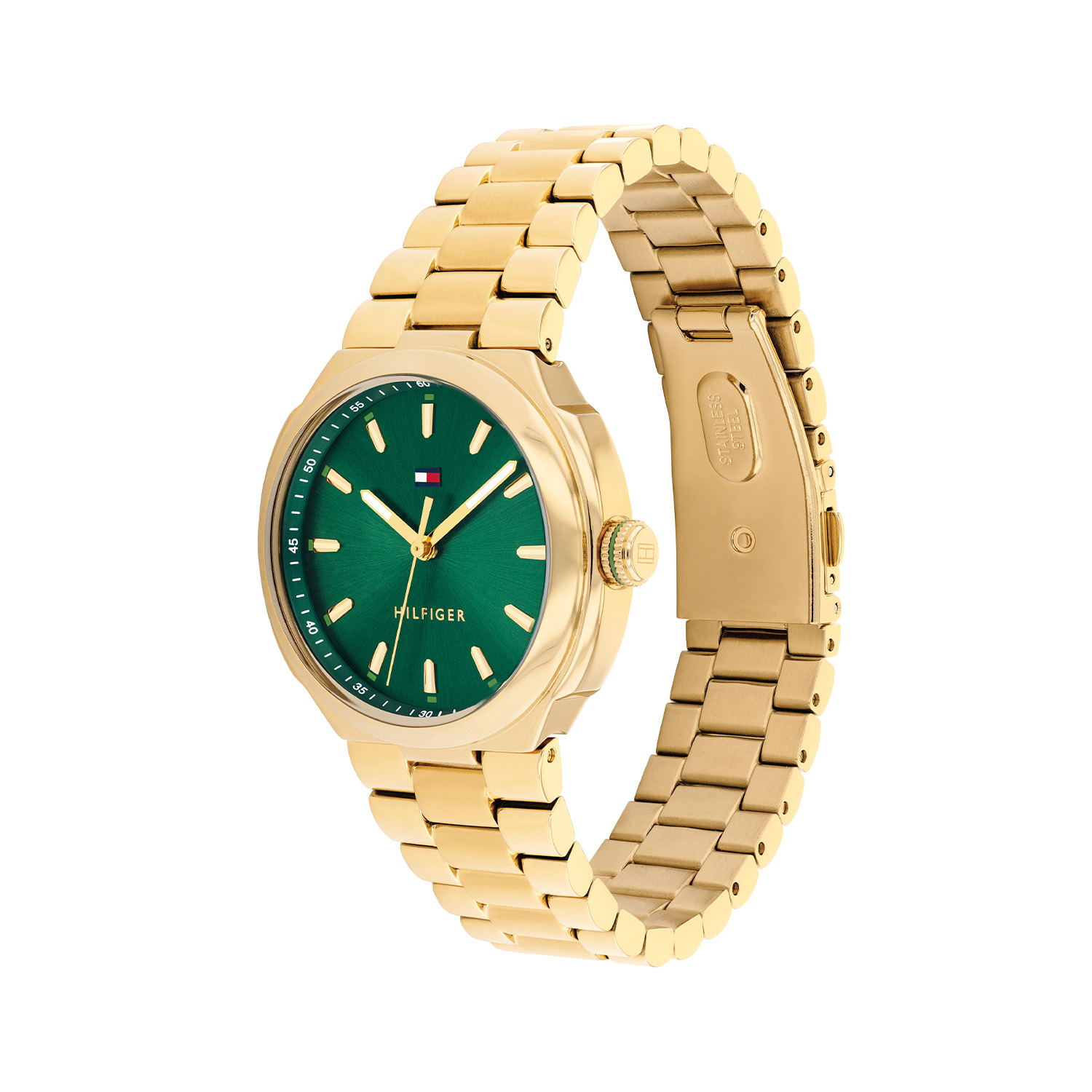 Dit volledig goudkleurige horloge heeft een 36mm stalen kast en stalen band. De groene wijzerplaat is voorzien van goudkleurige wijzers en indexen. De wijzers zijn afgewerkt met witte superluminova voor een betere leesbaarheid in het donker. Het horloge is getest op een waterdichtheid van 3 ATM / 30 M en wordt afgeschermd door een mineraalglas.