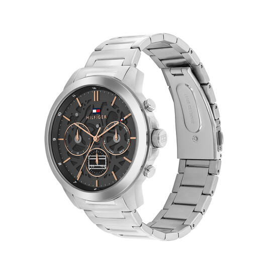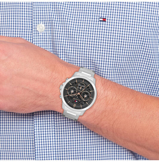 Dit Tommy Hilfiger herenhorloge heeft een quartz uurwerk en een grijze wijzerplaat met mineraalglas. De roestvrijstalen kast van 43 mm en zilverkleurige band van 21 mm geven het een moderne uitstraling. Voorzien van een vouwsluiting en waterbestendig tot 5 ATM. Een tijdloos accessoire voor jarenlang draagplezier!.