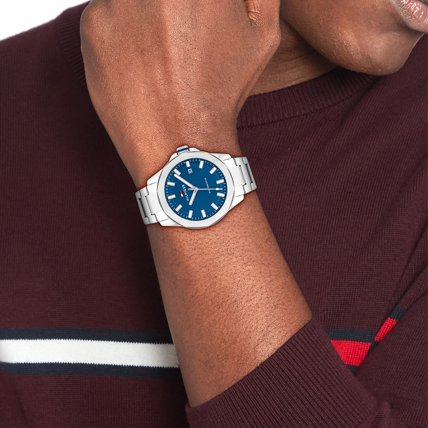 Dit horloge van Tommy Hilfiger uit de Lars serie is een stijvol herenhorloge die niet in je collectie mag ontbreken. Het herenhorloge heeft een stalen kast met 10 hoekige bezel en een blauwe wijzerplaat met een datum en lumibrite inleg in de wijzers en uurstrepen. Dit model heeft een automatisch uurwerk en loopt op de beweging van de pols. Aan de kast zit een stalen schakelband met een vouwsluiting. Het horloge heeft een mineraalglas, een afmeting van 42mm en is 5ATM.
