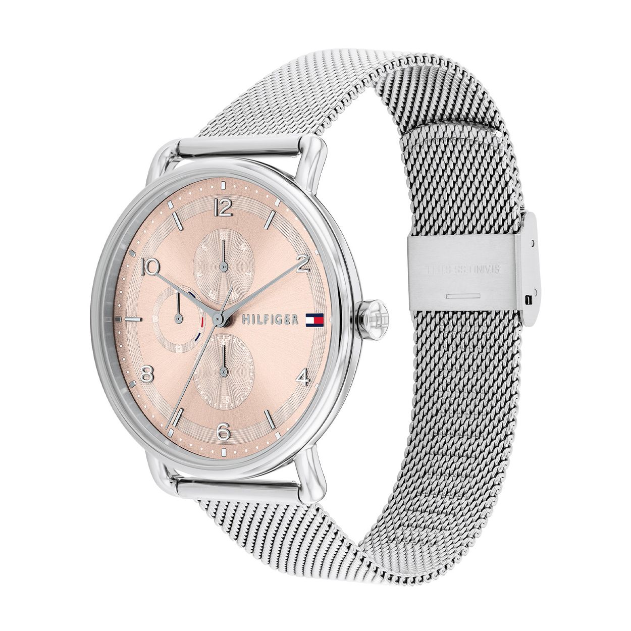 Dit horloge van Tommy Hilfiger is een fashion horloge die zeker in je collectie past. Het stalen dameshorloge heeft een ronde zilverkleurige kast met een gladde bezel. Op de roze sunray wijzerplaat zijn de dag,- datum,- 24-uursaanduiding en de wijzers op minimalistische manier zichtbaar. Het horloge is multifunctioneel en heeft een zilverkleurige milanese band, een mineraalglas, een doorsnee van 40mm en is 3ATM.