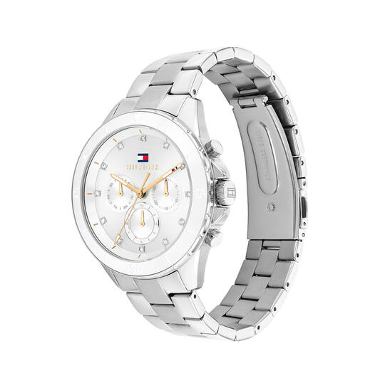 Dit horloge van Tommy Hilfiger is een luxe sportief dameshorloge die niet in je collectie mag ontbreken. Het stalen dameshorloge heeft een ronde zilverkleurige kast met een witte ceramic bezel en een witte sunray wijzerplaat met dag, - datum,- en 24-uursaanduiding. De uren worden weergegeven met kristallen. De zilverkleurige schakelband is op lengte verstelbaar en heeft een vouwsluiting. Het horloge heeft een mineraalglas, een doorsnee van 40mm en is 5ATM.