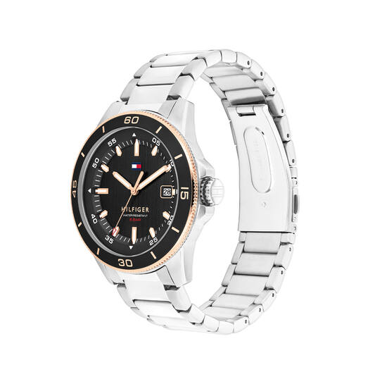 Dit Tommy Hilfiger horloge is een sportief herenhorloge die niet in je collectie mag ontbreken. Het stalen horloge heeft een ronde kast met een zwarte aluminium bezel en een zwarte geschuurde wijzerplaat met een datum. Aan de kast zit een stalen schakelband met een vouwsluiting. Het horloge heeft een mineraalglas, een doorsnee van 43mm en is 5ATM.