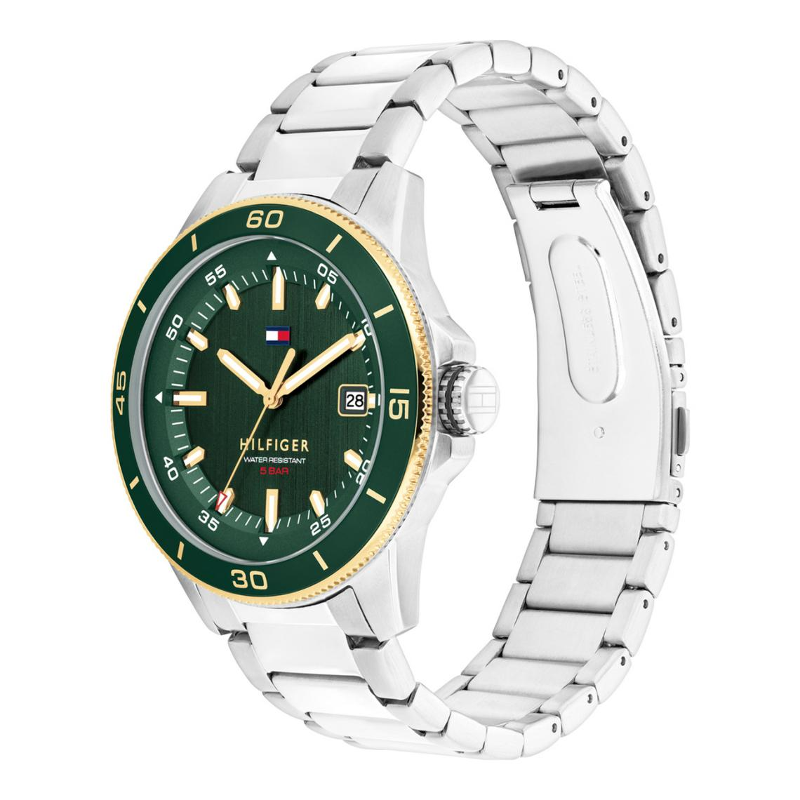 Dit Tommy Hilfiger horloge is een sportief herenhorloge die niet in je collectie mag ontbreken. Het stalen horloge heeft een ronde kast met een groene aluminium bezel en een groene geschuurde wijzerplaat met een datum. Aan de kast zit een stalen schakelband met een vouwsluiting. Het horloge heeft een mineraalglas, een doorsnee van 43mm en is 5ATM.