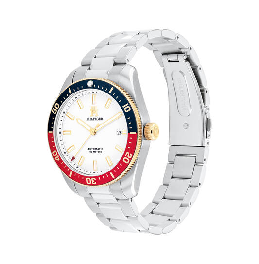Dit Tommy Hilfiger horloge heeft een stijlvol en klassiek ontwerp. Het horloge heeft een stalen kast en band met een diameter van 40MM. Het horloge heeft een witte analoge wijzerplaat met goudkleurige wijzers en indexen. De bezel zorgt voor een mooi contrast met de typische Tommy Hilfger kleuren combinatie van blauw, rood en het wit van de wijzerplaat.