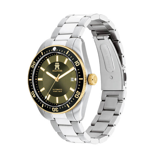 Dit horloge van Tommy Hilfiger is een luxe herenhorloge die niet in je collectie mag ontbreken. Het stalen herenhorloge heeft een ronde zilverkleurige kast met een zwarte bezel en een groene wijzerplaat met lumibrite strepen, goudkleurige wijzers als uursaanduiding en een datum. Het uurwerk is automatisch en laadt op door de beweging van de pols. De zilverkleurige schakelband is op lengte verstelbaar en heeft een vouwsluiting. Door een glas aan de achterkant van het horloge is het uurwerk zichtbaar. Het horloge heeft een mineraalglas, een doorsnee van 40mm en is 10ATM.