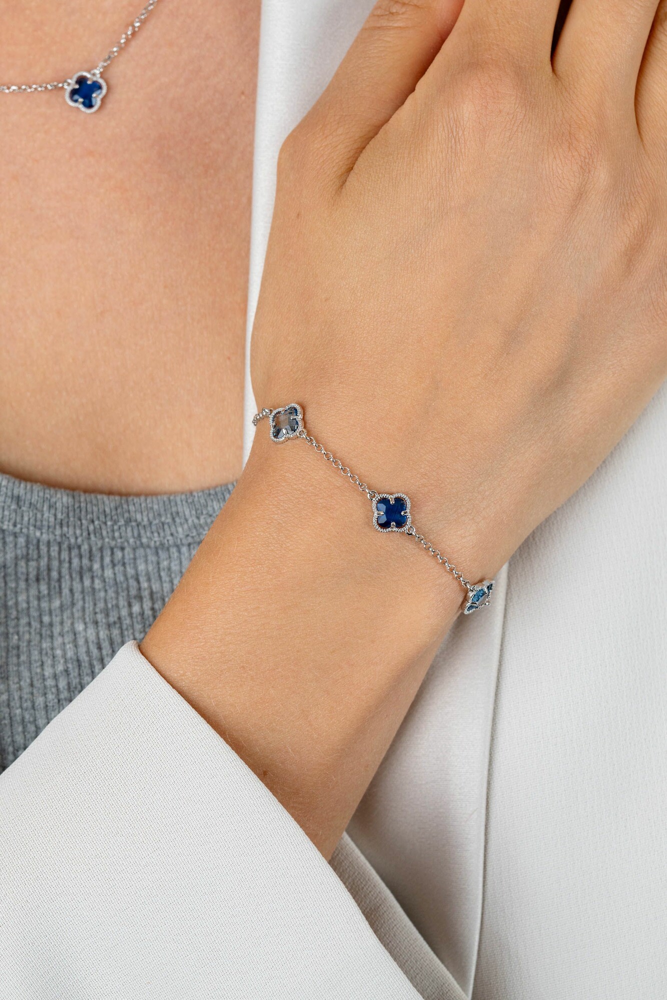 ZINZI zilveren schakel armband 9mm breed, met twee lichtblauwe klavers en een donkerblauwe klaver in het midden, gelijkmatig verdeeld. De lengte is te variëren tussen 17cm en 20cm. Vervaardigd van eerste gehalte zilver (925) en voorzien van een extra rodiumlaag voor een langdurige glans.