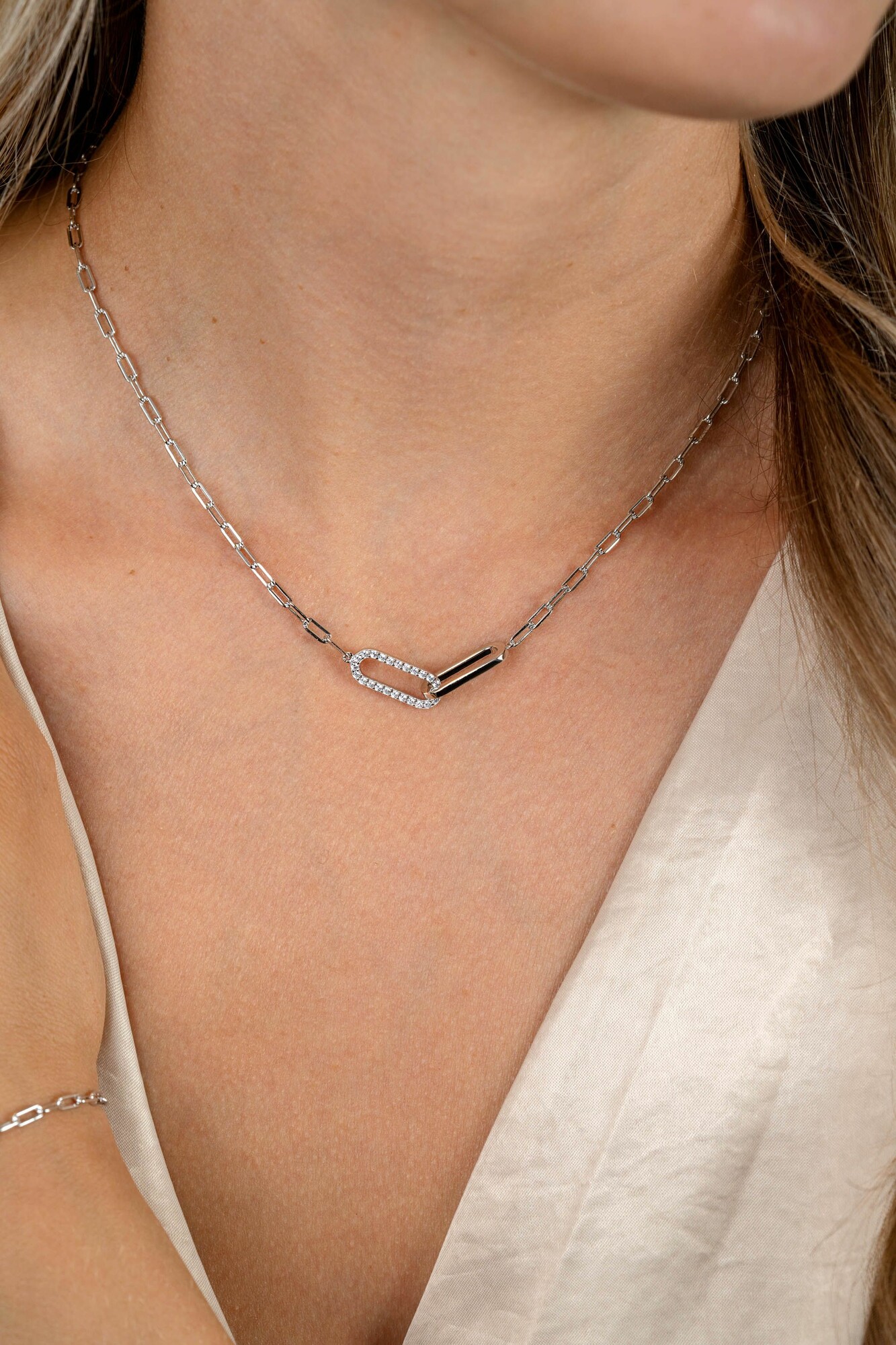 ZINZI zilveren paperclip schakelketting, waarbij in het midden twee open ovale schakels (7mm breed) met elkaar verbonden zijn. Eén ovale schakel is bezet met witte zirkonia's en de andere ovale schakel is glad. De lengte van de ketting is te variëren tussen 40cm en 45cm. Vervaardig van eerste gehalte zilver (925) en en voorzien van een extra rodiumlaag voor een langdurige glans.