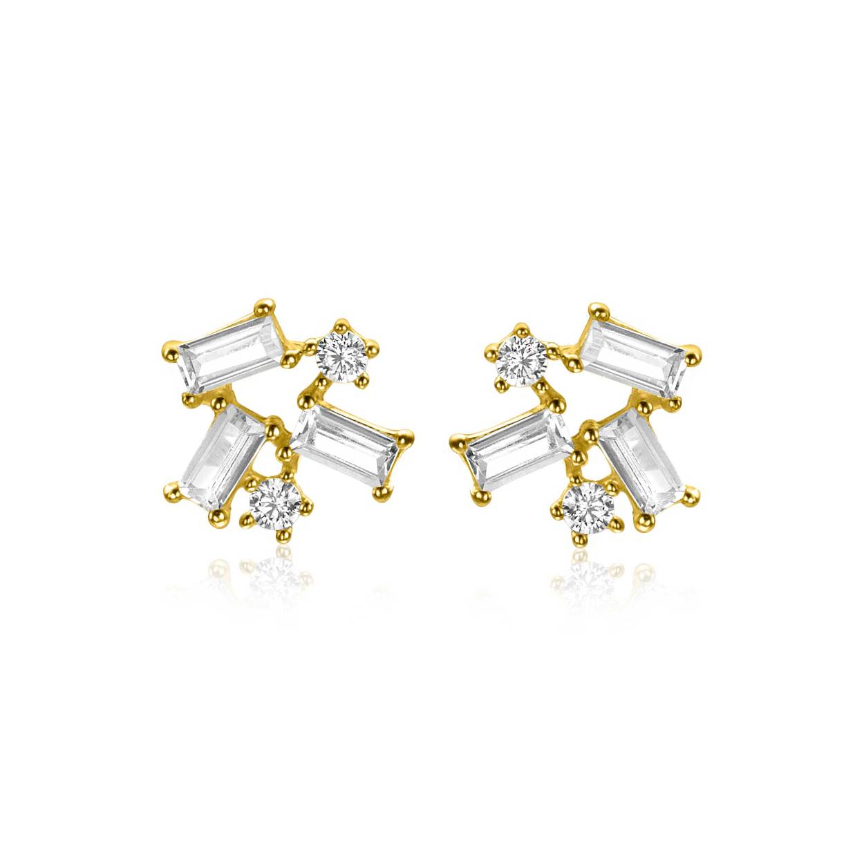 ZINZI Gold 14 karaat gouden fantasie oorknoppen met drie baquette geslepen rechthoekige witte zirkonia's en twee ronde zirkonia's. De zettingen zijn afwisselend met elkaar verbonden waardoor er een verbonden oorknoop onstaat. De oorknoppen zijn 8mm lang. Ook mooi te combineren met de bijpassende hanger. Vervaardig van geheel 14 karaat goud (585).