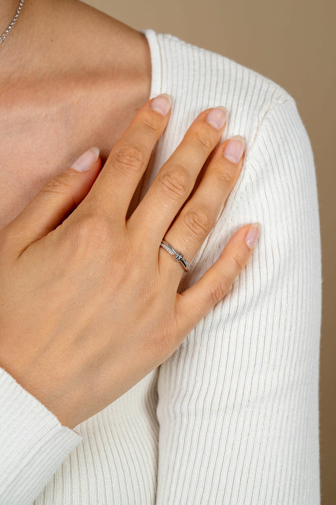 ZINZI zilveren multi-look ring (4mm breed) met een knoop in het midden. Door de knoop ontstaan er twee banen, bij beide banen is steeds de ene helft bezet met witte zirkonia's en de andere helft is glad. Maak je look compleet met de bijpassende ketting! Vervaardigd van eerste gehalte zilver (925) en voorzien van een extra rodiumlaag voor een langdurige glans.